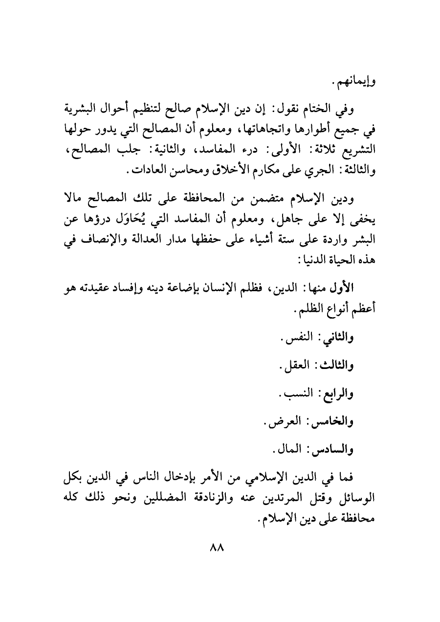 ودين الإسلام متضمن من المحافظة على تلك المصالح ما لا يخفى إلا على جاهل، ومعلوم أن المفاسد التي يُحَاوَل درؤها عن البشر واردة على ستة أشياء على حفظها مدار العدالة والإنصاف في هذه الحياة الدنيا: