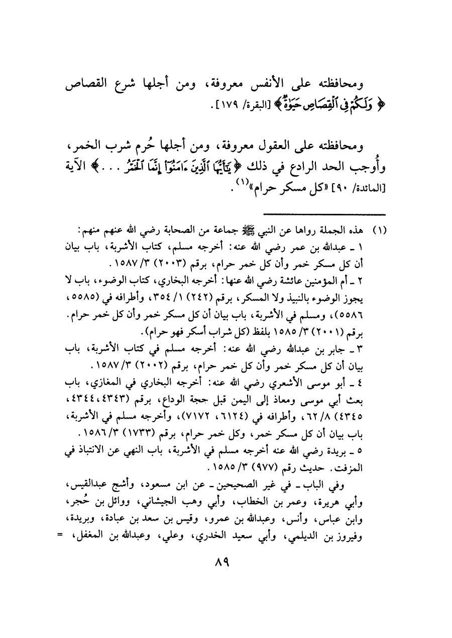 ومحافظته على العقول معروفة، ومن أجلها حُرم شرب الخمر، وأُوجب الحد الرادع في ذلك {يَا أَيُّهَا الَّذِينَ آمَنُوا إِنَّمَا الْخَمْرُ ... } الآية [المائدة / ٩٠] "كل مسكر حرام" (١).