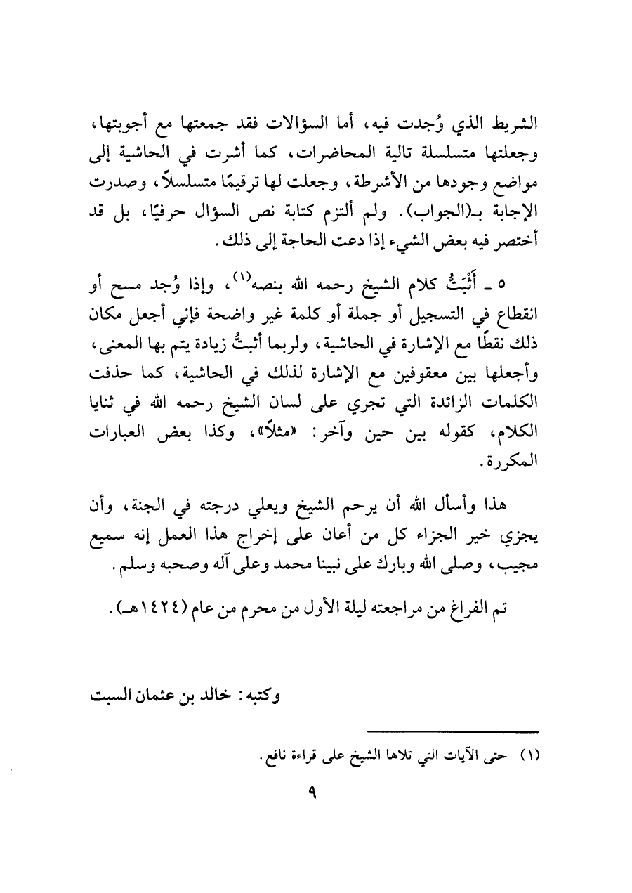 الشريط الذي وُجدت فيه، أما السؤالات فقد جمعتها مع أجوبتها، وجعلتها متسلسلة تالية المحاضرات، كما أشرت في الحاشية إلى مواضع وجودها من الأشرطة، وجعلت لها ترقيمًا متسلسلًا، وصدرت الإجابة بـ (الجواب). ولم ألتزم كتابة نص السؤال حرفيًّا، بل قد أختصر فيه بعض الشيء إذا دعت الحاجة إلى ذلك.
