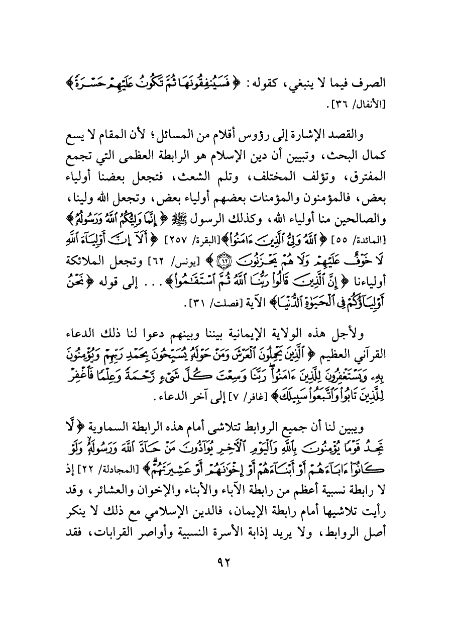 والقصد الإشارة إلى رؤوس أقلام من المسائل؛ لأن المقام لا يسع كمال البحث، وتبيين أن دين الإسلام هو الرابطة العظمى التي تجمع المفترق، وتؤلف المختلف، وتلم الشعث، فتجعل بعضنا أولياء بعض، فالمؤمنون والمؤمنات بعضهم أولياء بعض، وتجعل الله ولينا، والصالحين منا أولياء الله، وكذلك الرسول - صلى الله عليه وسلم - {إِنَّمَا وَلِيُّكُمُ اللَّهُ وَرَسُولُهُ} [المائدة: ٥٥] {اللَّهُ وَلِيُّ الَّذِينَ آمَنُوا} [البقرة: ٢٥٧] {أَلَا إِنَّ أَوْلِيَاءَ اللَّهِ لَا خَوْفٌ عَلَيهِمْ وَلَا هُمْ يَحْزَنُونَ (٦٢)} [يونس: ٦٢] وتجعل الملائكة أولياءنا {إِنَّ الَّذِينَ قَالُوا رَبُّنَا اللَّهُ ثُمَّ اسْتَقَامُوا} ... إلى قوله {نَحْنُ أَوْلِيَاؤُكُمْ فِي الْحَيَاةِ الدُّنْيَا} الآية [فصلت / ٣١].