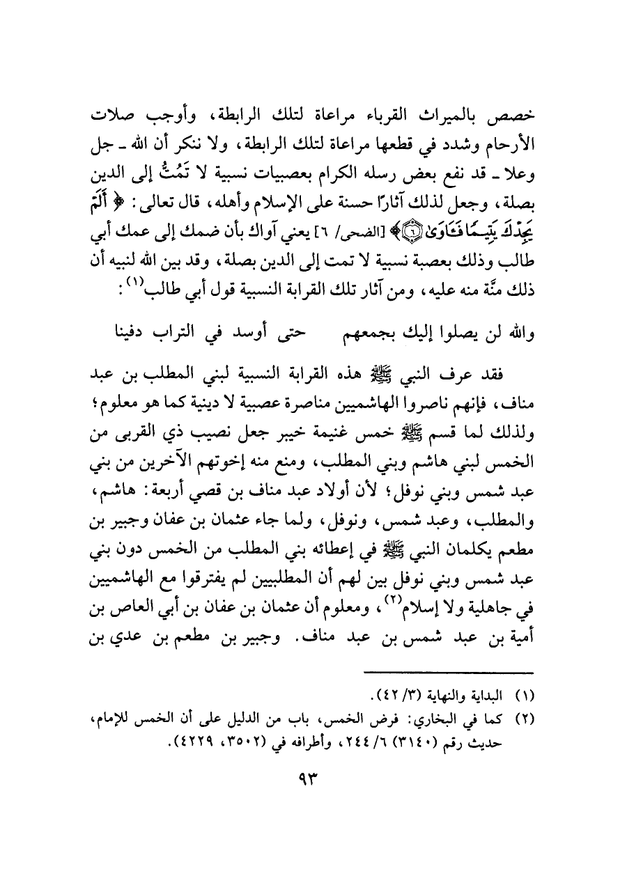 فقد عرف النبي - صلى الله عليه وسلم - هذه القرابة النسبية لبني المطلب بن عبد مناف، فإنهم ناصروا الهاشميين مناصرة عصبية لا دينية كما هو معلوم؛ ولذلك لما قسم - صلى الله عليه وسلم - خمس غنيمة خيبر جعل نصيب ذي القربى من الخمس لبني هاشم وبني المطلب، ومنع منه إخوتهم الآخرين من بني عبد شمس وبني نوفل؛ لأن أولاد عبد مناف بن قصي أربعة: هاشم، والمطلب، وعبد شمس، ونوفل، ولما جاء عثمان بن عفان وجبير بن مطعم يكلمان النبي - صلى الله عليه وسلم - في إعطائه بني المطلب من الخمس دون بني عبد شمس وبني نوفل بين لهم أن المطلبيين لم يفترقوا مع الهاشميين في جاهلية ولا إسلام (٢)، ومعلوم أن عثمان بن عفان بن أبي العاص بن أمية بن عبد شمس بن عبد مناف. وجبير بن مطعم بن عدي بن