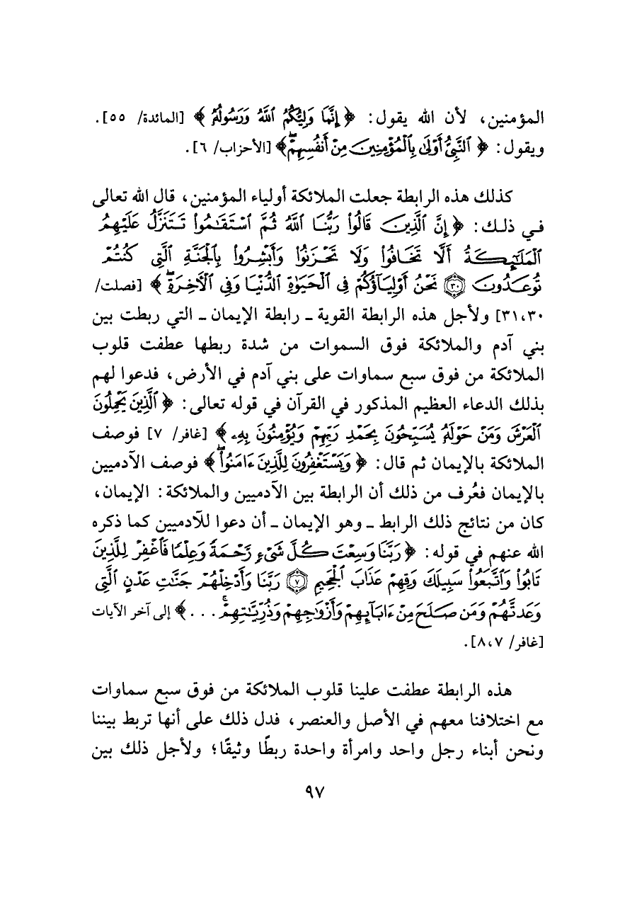 كذلك هذه الرابطة جعلت الملائكة أولياء المؤمنين، قال الله تعالى في ذلك: {إِنَّ الَّذِينَ قَالُوا رَبُّنَا اللَّهُ ثُمَّ اسْتَقَامُوا تَتَنَزَّلُ عَلَيهِمُ الْمَلَائِكَةُ أَلَّا تَخَافُوا وَلَا تَحْزَنُوا وَأَبْشِرُوا بِالْجَنَّةِ الَّتِي كُنْتُمْ تُوعَدُونَ (٣٠) نَحْنُ أَوْلِيَاؤُكُمْ فِي الْحَيَاةِ الدُّنْيَا وَفِي الْآخِرَةِ} [فصلت: ٣٠, ٣١] ولأجل هذه الرابطة القوية - رابطة الإيمان - التي ربطت بين بني آدم والملائكة فوق السموات من شدة ربطها عطفت قلوب الملائكة من فوق سبع سماوات علي بني آدم في الأرض، فدعوا لهم بذلك الدعاء العظيم المذكور في القرآن في قوله تعالى: {الَّذِينَ يَحْمِلُونَ الْعَرْشَ وَمَنْ حَوْلَهُ يُسَبِّحُونَ بِحَمْدِ رَبِّهِمْ وَيُؤْمِنُونَ بِهِ} [غافر: ٧] فوصف الملائكة بالإيمان ثم قال: {وَيَسْتَغْفِرُونَ لِلَّذِينَ آمَنُوا} فوصف الآدميين بالإيمان فعُرف من ذلك أن الرابطة بين الآدميين والملائكة: الإيمان، كان من نتائج ذلك الرابط - وهو الإيمان - أن دعوا للآدميين كما ذكره الله عنهم في قوله: {رَبَّنَا وَسِعْتَ كُلَّ شَيءٍ رَحْمَةً وَعِلْمًا فَاغْفِرْ لِلَّذِينَ تَابُوا وَاتَّبَعُوا سَبِيلَكَ وَقِهِمْ عَذَابَ الْجَحِيمِ (٧) رَبَّنَا وَأَدْخِلْهُمْ جَنَّاتِ عَدْنٍ الَّتِي وَعَدْتَهُمْ وَمَنْ صَلَحَ مِنْ آبَائِهِمْ وَأَزْوَاجِهِمْ وَذُرِّيَّاتِهِمْ ... } إلى آخر الآيات [غافر / ٧، ٨].