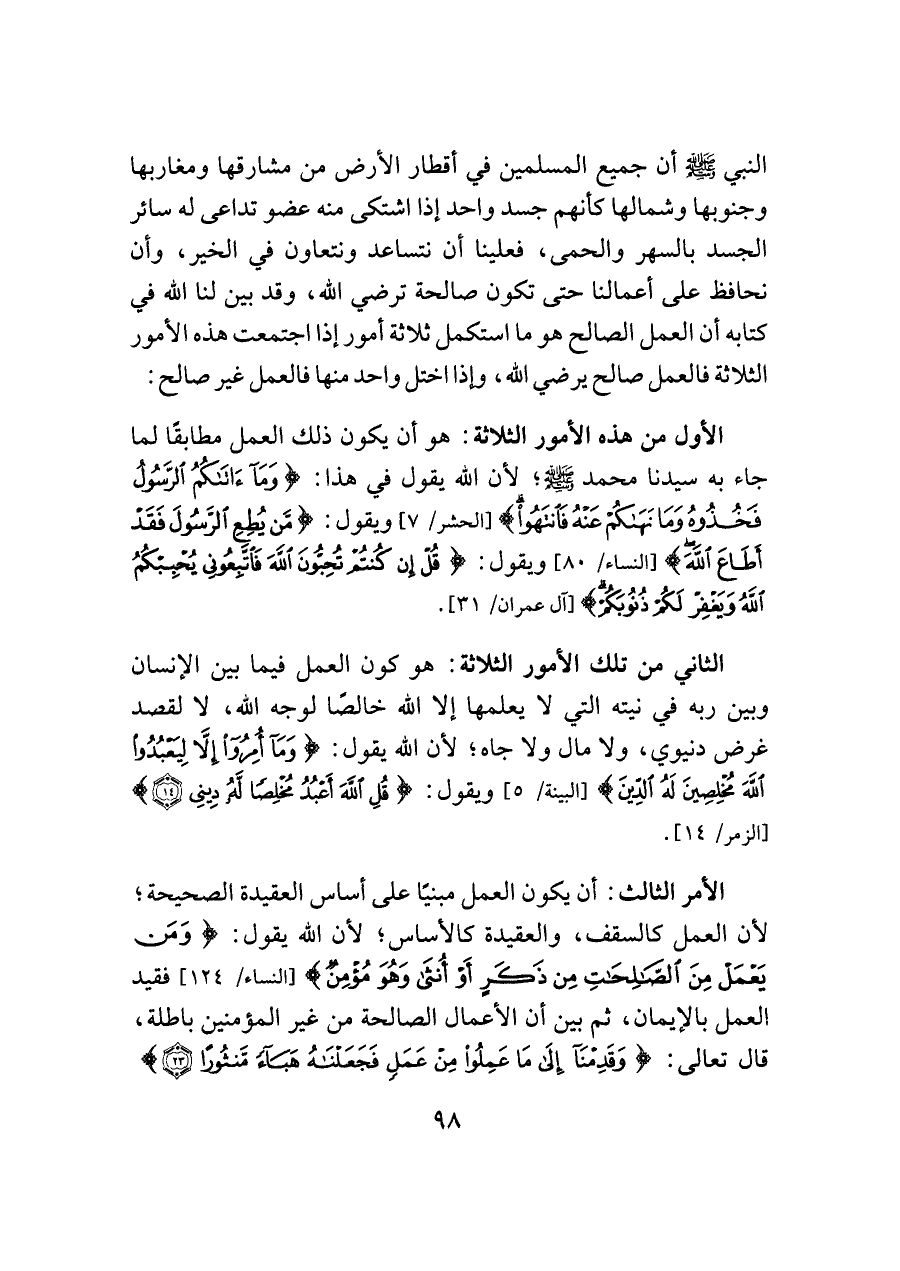 النبي - صلى الله عليه وسلم - أن جميع المسلمين في أقطار الأرض من مشارقها ومغاربها وجنوبها وشمالها كأنهم جسد واحد إذا اشتكى منه عضو تداعى له سائر الجسد بالسهر والحمى، فعلينا أن نتساعد ونتعاون في الخير، وأن نحافظ على أعمالنا حتى تكون صالحة ترضي الله، وقد بين لنا الله في كتابه أن العمل الصالح هو ما استكمل ثلاثة أمور إذا اجتمعت هذه الأمور الثلاثة فالعمل صالح يرضي الله، وإذا اختل واحد منها فالعمل غير صالح: