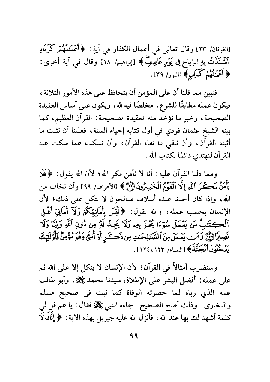 فتبين مما قلنا أن على المؤمن أن يتحافظ على هذه الأمور الثلاثة، فيكون عمله مطابقًا للشرع، مخلصًا فيه لله، ويكون على أساس العقيدة الصحيحة، وخير ما تؤخذ منه العقيدة الصحيحة: القرآن العظيم، كما بينه الشيخ عثمان فودي في أول كتابه إحياء السنة، فعلينا أن نثبت ما أثبته القرآن، وأن ننفي ما نفاه القرآن، وأن نسكت عما سكت عنه القرآن لنهتدي دائمًا بكتاب الله.
