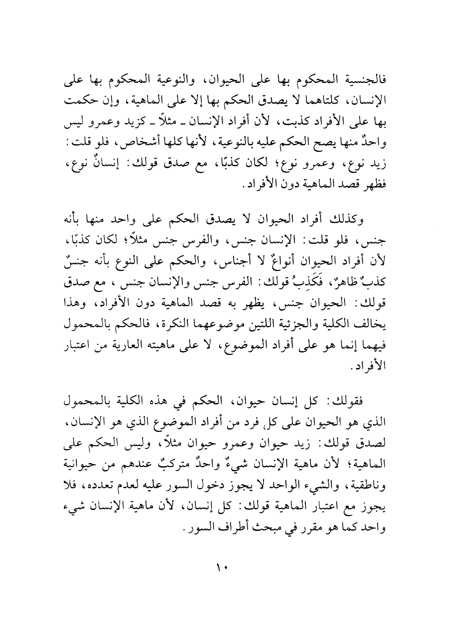 وكذلك أفراد الحيوان لا يصدق الحكم على واحد منها بأنه جنس، فلو قلت: الإنسان جنس، والفرس جنس مثلًا؛ لكان كذبًا، لأن أفراد الحيوان أنواعٌ لا أجناس، والحكم على النوع بأنه جنسٌ كذبٌ ظاهرٌ، فَكَذِبُ قولك: الفرس جنس والإنسان جنس، مع صدق قولك: الحيوان جنس، يظهر به قصد الماهية دون الأفراد، وهذا يخالف الكلية والجزئية اللتين موضوعهما النكرة، فالحكم بالمحمول فيهما إنما هو على أفراد الموضوع، لا على ماهيته العارية من اعتبار الأفراد.