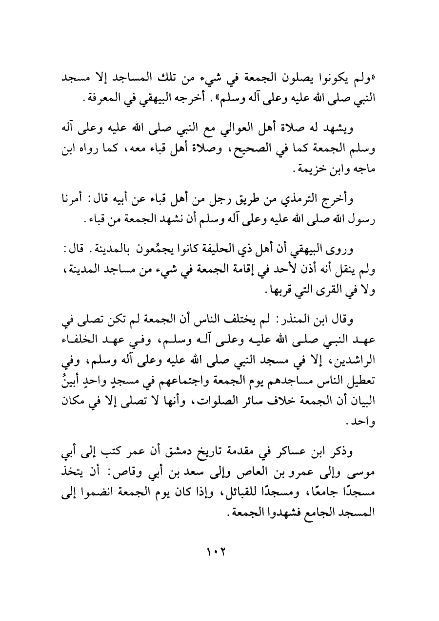 "ولم يكونوا يصلون الجمعة في شيء من تلك المساجد إلا مسجد النبي صلى اللَّه عليه وعلى آله وسلم". أخرجه البيهقي في المعرفة.