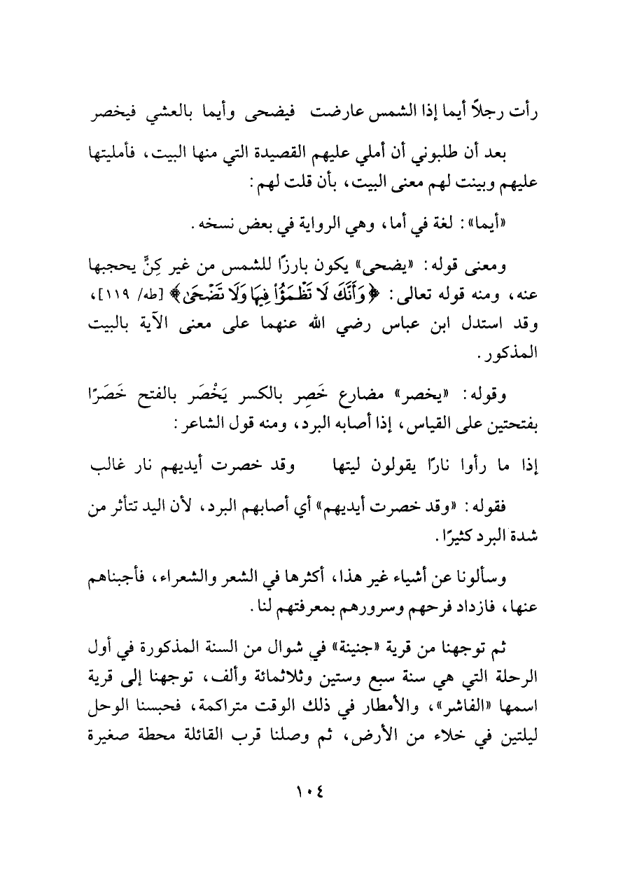 ثم توجهنا من قرية "جنينة" في شوال من السنة المذكورة في أول الرحلة التي هي سنة سبع وستين وثلاثمائة وألف، توجهنا إلى قرية اسمها "الفاشر"، والأمطار في ذلك الوقت متراكمة، فحبسنا الوحل ليلتين في خلاء من الأرض، ثم وصلنا قرب القائلة محطة صغيرة