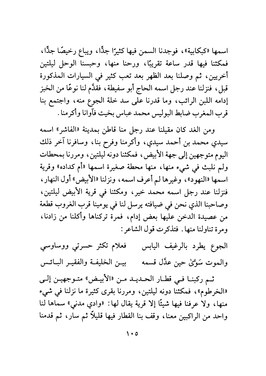 ومن الغد كان مقيلنا عند رجل منا قاطن بمدينة "الفاشر" اسمه سيدي محمد بن أحمد سيدي، وأكرمنا وفرح بنا، وسافرنا آخر ذلك اليوم متوجهين إلى جهة الأبيض، فمكثنا دونه ليلتين، ومررنا بمحطات ولم نلبث في شيء منها، منها محطة صغيرة اسمها "أم كداده" وقرية اسمها "النهود"، وغيرها لم أعرف اسمه، ونزلنا "الأبيض" أول النهار، فنزلنا عند رجل اسمه محمد خير، ومكثنا في قرية الأبيض ليلتين، وصاحبنا الذي نحن في ضيافته يرسل لنا في يومينا قرب الغروب قطعة من عصيدة الدخن عليها بعض إدام، فمرة تركنا وأكلنا من زادنا، ومرة تناولنا منها. فتذكرت قول الشاعر: