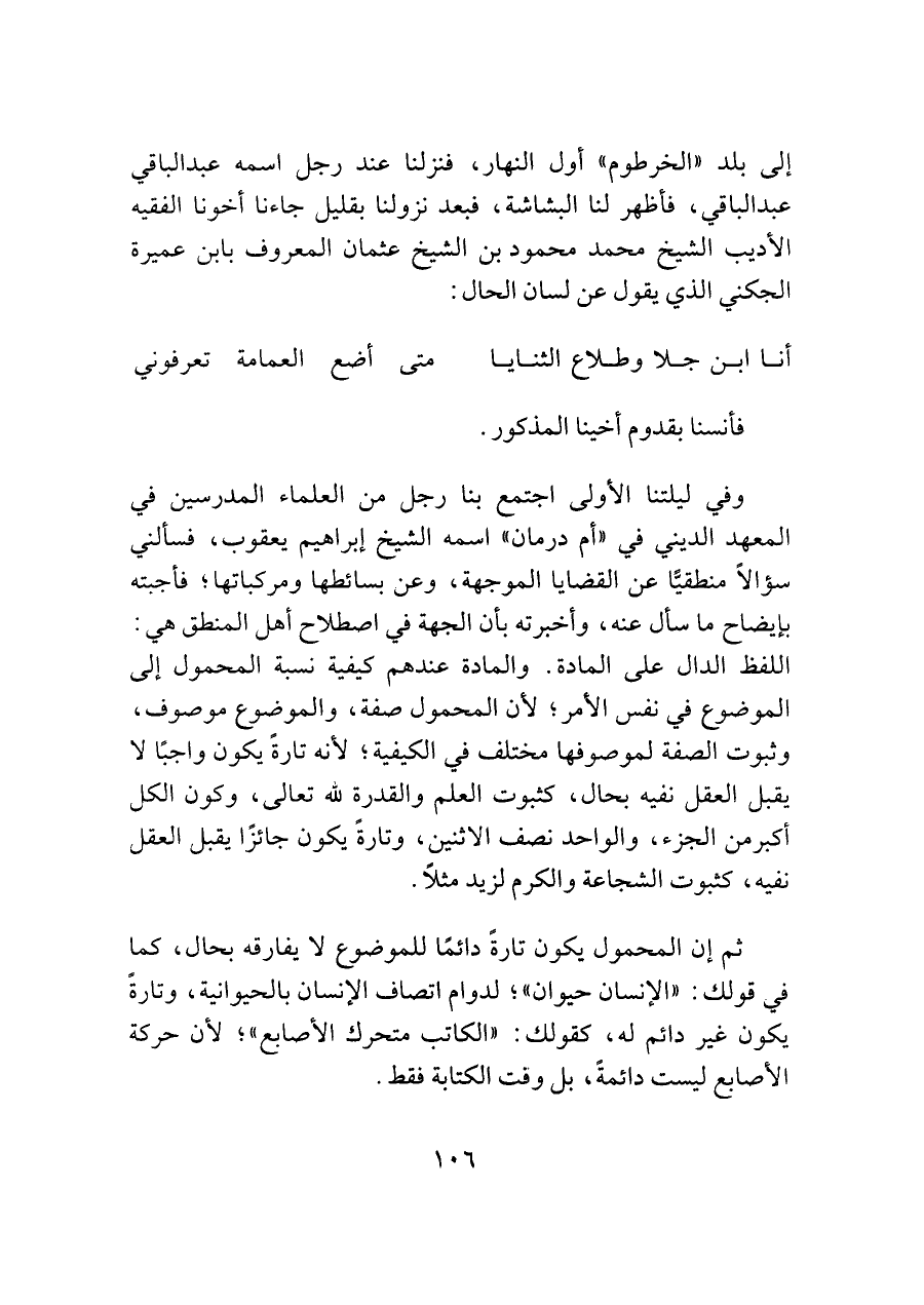 وفي ليلتنا الأولى اجتمع بنا رجل من العلماء المدرسين في المعهد الديني في "أم درمان" اسمه الشيخ إبراهيم يعقوب، فسألني سؤالًا منطقيًّا عن القضايا الموجهة، وعن بسائطها ومركباتها؟ فأجبته بإيضاح ما سأل عنه، وأخبرته بأن الجهة في اصطلاح أهل المنطق هي: اللفظ الدال على المادة. والمادة عندهم كيفية نسبة المحمول إلى الموضوع في نفس الأمر؛ لأن المحمول صفة، والموضوع موصوف، وثبوت الصفة لموصوفها مختلف في الكيفية؛ لأنه تارةً يكون واجبًا لا يقبل العقل نفيه بحال، كثبوت العلم والقدرة للَّه تعالى، وكون الكل أكبر من الجزء، والواحد نصف الاثنين، وتارةً يكون جائزًا يقبل العقل نفيه، كثبوت الشجاعة والكرم لزيد مثلًا.