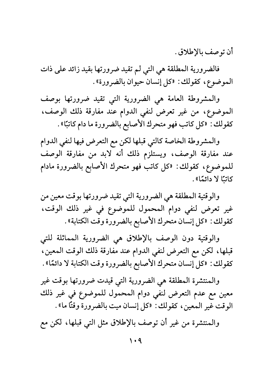 فالضرورية المطلقة هي التي لم تقيد ضرورتها بقيد زائد على ذات الموضوع، كقولك: "كل إنسان حيوان بالضرورة".
