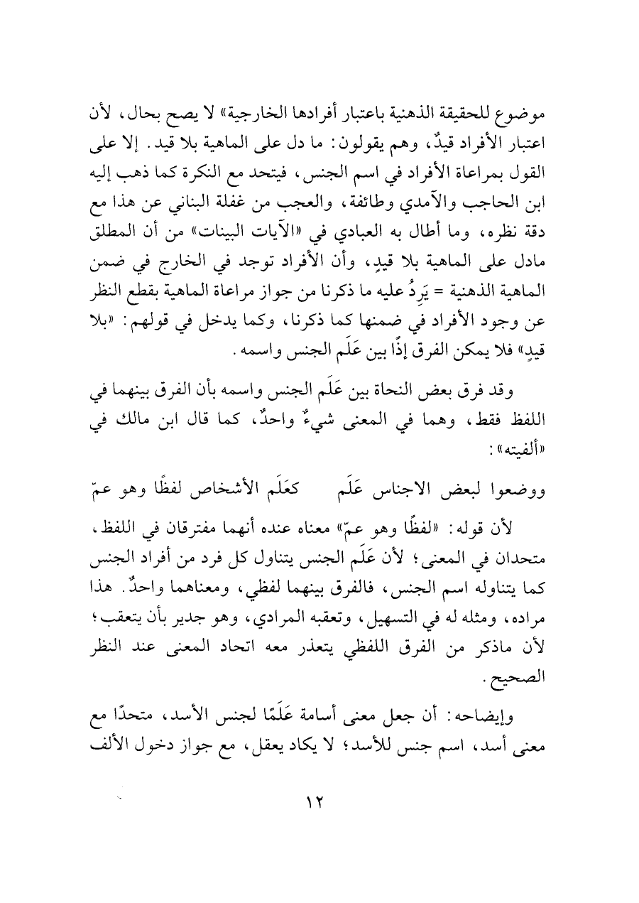 موضوع للحقيقة الذهنية باعتبار أفرادها الخارجية" لا يصح بحال، لأن اعتبار الأفراد قيدٌ، وهم يقولون: ما دل على الماهية بلا قيد. إلا على القول بمراعاة الأفراد في اسم الجنس، فيتحد مع النكرة كما ذهب إليه ابن الحاجب والآمدي وطائفة، والعجب من غفلة البناني عن هذا مع دقة نظره، وما أطال به العبادي في "الآيات البينات" من أن المطلق ما دل على الماهية بلا قيدٍ، وأن الأفراد توجد في الخارج في ضمن الماهية الذهنية = يَرِدُ عليه ما ذكرنا من جواز مراعاة الماهية بقطع النظر عن وجود الأفراد في ضمنها كما ذكرنا، وكما يدخل في قولهم: "بلا قيدٍ" فلا يمكن الفرق إذًا بين عَلَم الجنس واسمه.