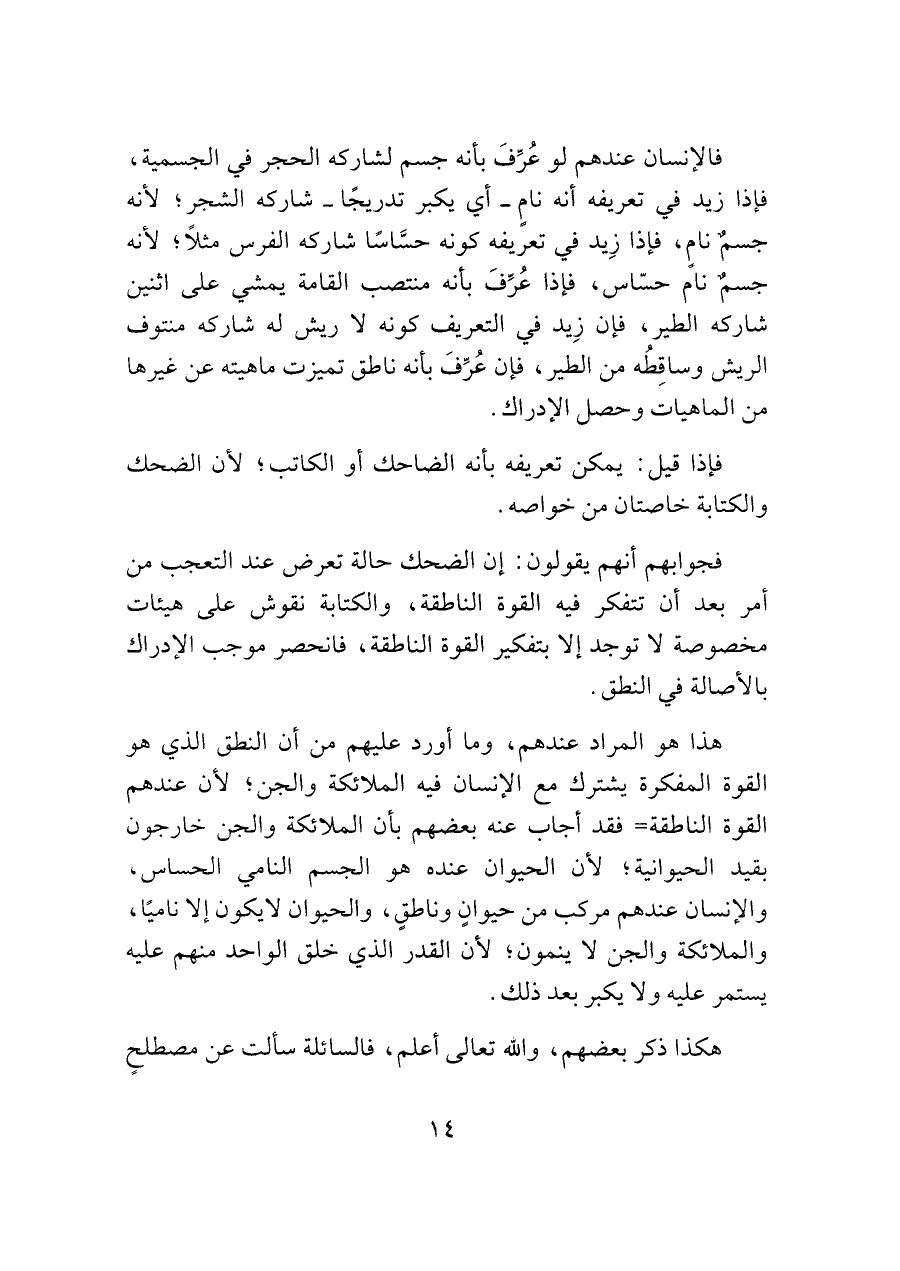 هذا هو المراد عندهم، وما أورد عليهم من أن النطق الذي هو القوة المفكرة يشترك مع الإنسان فيه الملائكة والجن؛ لأن عندهم القوة الناطقة = فقد أجاب عنه بعضهم بأن الملائكة والجن خارجون بقيد الحيوانية؛ لأن الحيوان عنده هو الجسم النامي الحساس، والإنسان عندهم مركب من حيوانٍ وناطقٍ، والحيوان لا يكون إلا ناميًا، والملائكة والجن لا ينمون؛ لأن القدر الذي خلق الواحد منهم عليه يستمر عليه ولا يكبر بعد ذلك.