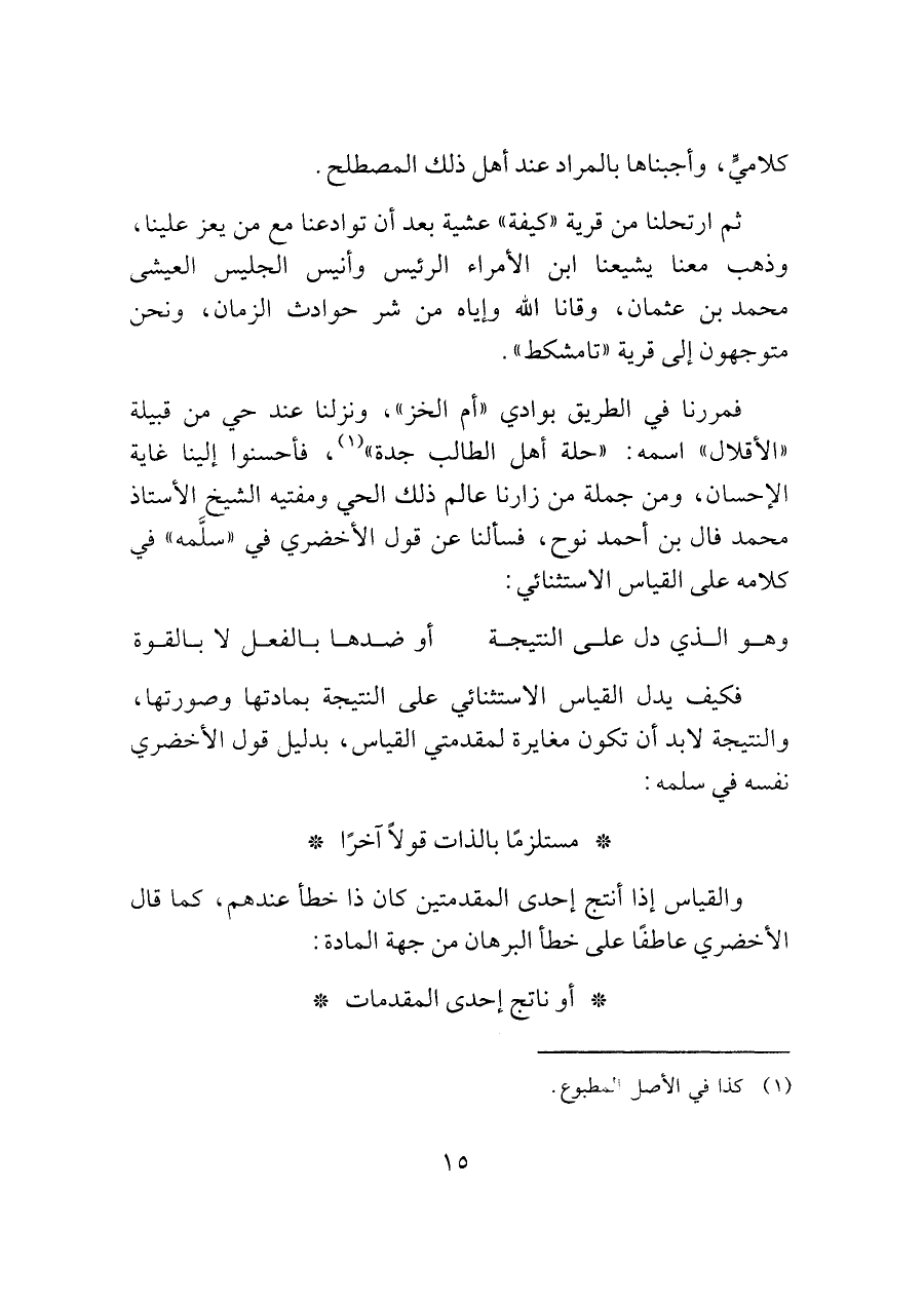 فمررنا في الطريق بوادي "أم الخز"، ونزلنا عند حي من قبيلة "الأقلال" اسمه: "حلة أهل الطالب جدة" (¬١)، فأحسنوا إلينا غاية الإحسان، ومن جملة من زارنا عالم ذلك الحي ومفتيه الشيخ الأستاذ محمد فال بن أحمد نوح، فسألنا عن قول الأخضري في "سلَّمه" في كلامه على القياس الاستثنائي: