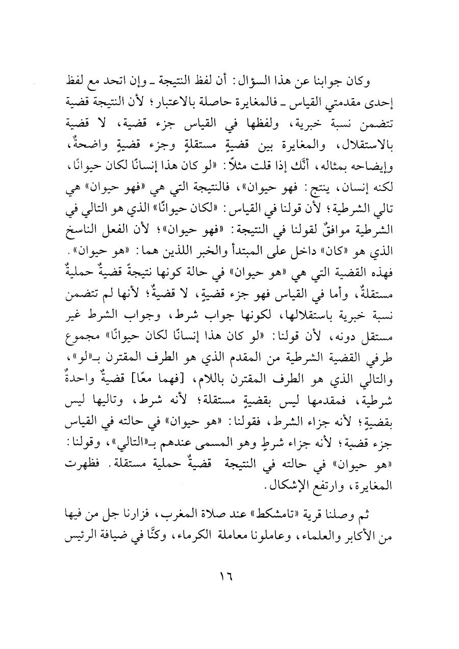 وكان جوابنا عن هذا السؤال: أن لفظ النتيجة -وإن اتحد مع لفظ إحدى مقدمتي القياس- فالمغايرة حاصلة بالاعتبار؛ لأن النتيجة قضية تتضمن نسبة خبرية، ولفظها في القياس جزء قضية، لا قضية بالاستقلال، والمغايرة بين قضيةٍ مستقلةٍ وجزء قضيةٍ واضحةٌ، وإيضاحه بمثاله، أنَّك إذا قلت مثلًا: "لو كان هذا إنسانًا لكان حيوانًا، لكنه إنسان، ينتج: فهو حيوان"، فالنتيجة التي هي "فهو حيوان" هي تالي الشرطية؛ لأن قولنا في القياس: "لكان حيوانًا" الذي هو التالي في الشرطية موافقٌ لقولنا في النتيجة: "فهو حيوان"؛ لأن الفعل الناسخ الذي هو "كان" داخل على المبتدأ والخبر اللذين هما: "هو حيوان". فهذه القضية التي هي "هو حيوان" في حالة كونها نتيجةً قضيةٌ حمليةٌ مستقلةٌ، وأما في القياس فهو جزء قضيةٍ، لا قضيةٌ؛ لأنها لم تتضمن نسبة خبرية باستقلالها، لكونها جواب شرط، وجواب الشرط غير مستقل دونه، لأن قولنا: "لو كان هذا إنسانًا لكان حيوانًا" مجموع طرفي القضية الشرطية من المقدم الذي هو الطرف المقترن بـ "لو"، والتالي الذي هو الطرف المقترن باللام، [فهما معًا] قضيةٌ واحدةٌ شرطية، فمقدمها ليس بقضيةٍ مستقلة؛ لأنه شرط، وتاليها ليس بقضيةٍ؛ لأنه جزاء الشرط، فقولنا: "هو حيوان" في حالته في القياس جزء قضية؛ لأنه جزاء شرطٍ وهو المسمى عندهم بـ "التالي"، وقولنا: "هو حيوان" في حالته في النتيجة قضية حملية مستقلة. فظهرت المغايرة، وارتفع الإشكال.