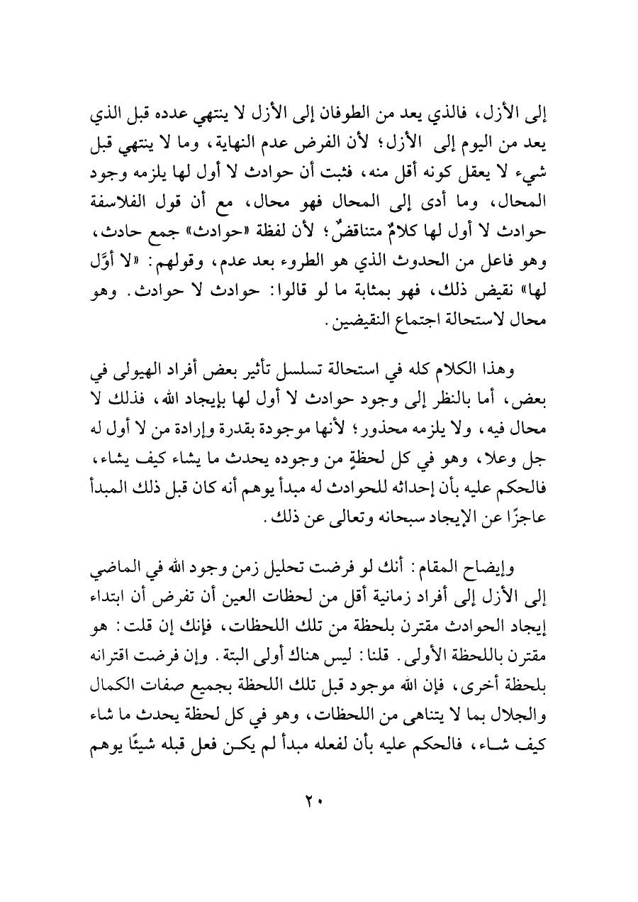 إلى الأزل، فالذي يعد من الطوفان إلى الأزل لا ينتهي عدده قبل الذي يعد من اليوم إلى الأزل؛ لأن الفرض عدم النهاية، وما لا ينتهي قبل شيء لا يعقل كونه أقل منه، فثبت أن حوادث لا أول لها يلزمه وجود المحال، وما أدى إلى المحال فهو محال، مع أن قول الفلاسفة حوادث لا أول لها كلامٌ متناقضٌ؛ لأن لفظة "حوادث" جمع حادث، وهو فاعل من الحدوث الذي هو الطروء بعد عدم، وقولهم: "لا أوَّل لها" نقيض ذلك، فهو بمثابة ما لو قالوا: حوادث لا حوادث. وهو محال لاستحالة اجتماع النقيضين.