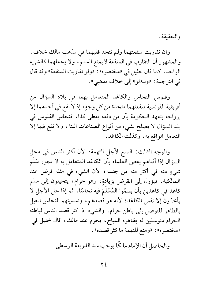 وفلوس النحاس والكاغد المتعامل بهما في بلاد السؤال من أفريقية الفرنسية منفعتهما متحدة من كل وجهٍ، إذ لا نفع في أحدهما إلا برواجه بتعهد الحكومة بأن من دلمحعه يعطى كذا، فنحاس الفلوس في بلد السؤال لا يصلح لشيء من أنواع الصناعات البتة، ولا نفع فيها إلا التعامل الواقع به، وكذلك الكاغد.