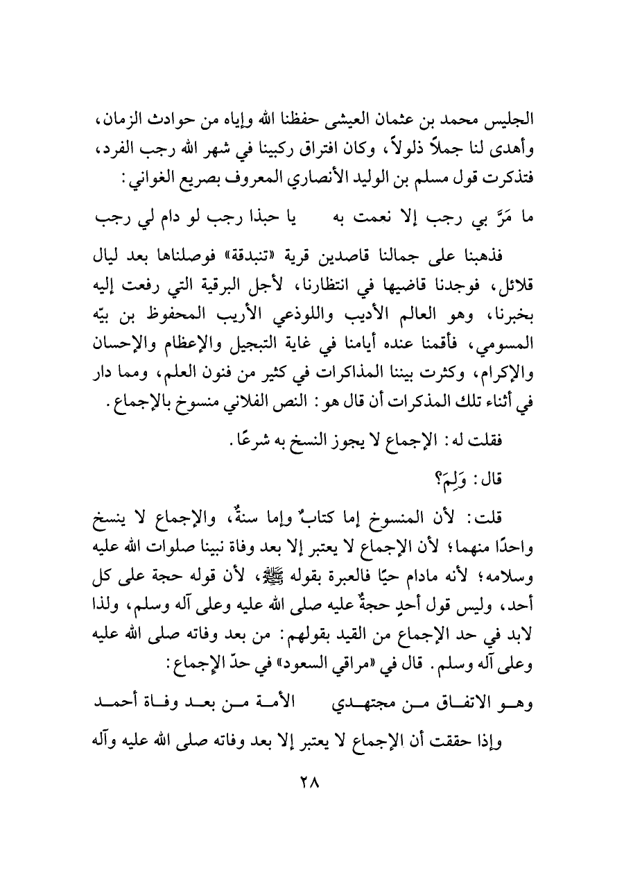 الجليس محمد بن عثمان العيشى حفظنا اللَّه وإياه من حوادث الزمان، وأهدى لنا جملًا ذلولًا، وكان افتراق ركبينا في شهر اللَّه رجب الفرد، فتذكرت قول مسلم بن الوليد الأنصاري المعروف بصريع الغواني: