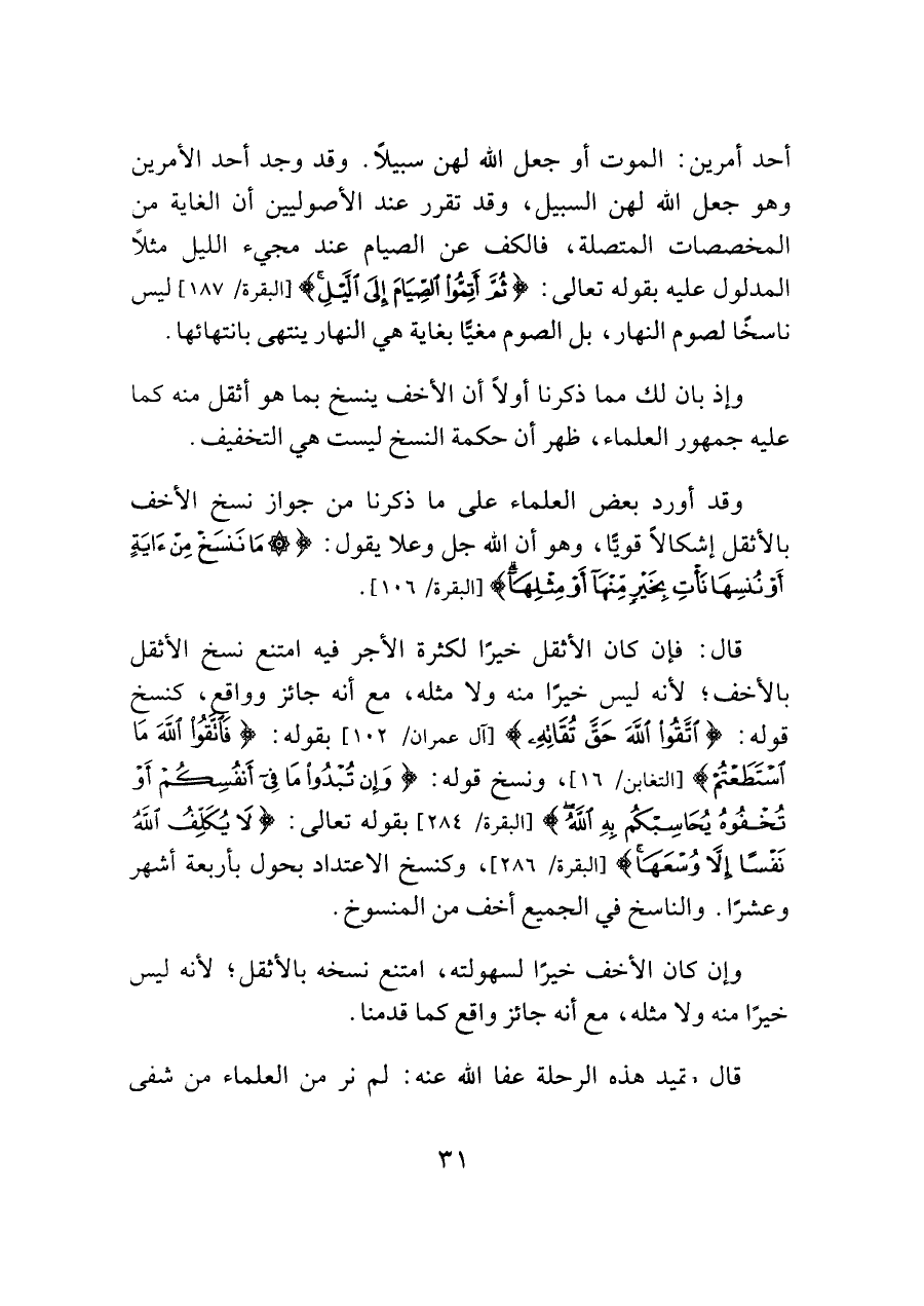 قال: فإن كان الأثقل خيرًا لكثرة الأجر فيه امتنع نسخ الأثقل بالأخف؛ لأنه ليس خيرًا منه ولا مثله، مع أنه جائز وواقع، كنسخ قوله: {اتَّقُوا اللَّهَ حَقَّ تُقَاتِهِ} [آل عمران/ ١٠٢] بقوله: {فَاتَّقُوا اللَّهَ مَا اسْتَطَعْتُمْ} [التغابن/ ١٦]، ونسخ قوله: {وَإِنْ تُبْدُوا مَا فِي أَنْفُسِكُمْ أَوْ تُخْفُوهُ يُحَاسِبْكُمْ بِهِ اللَّهُ} [البقرة/ ٢٨٤] بقوله تعالى: {لَا يُكَلِّفُ اللَّهُ نَفْسًا إِلَّا وُسْعَهَا} [البقرة/ ٢٨٦]، وكنسخ الاعتداد بحول بأربعة أشهر وعشرًا. والناسخ في الجميع أخف من المنسوخ.