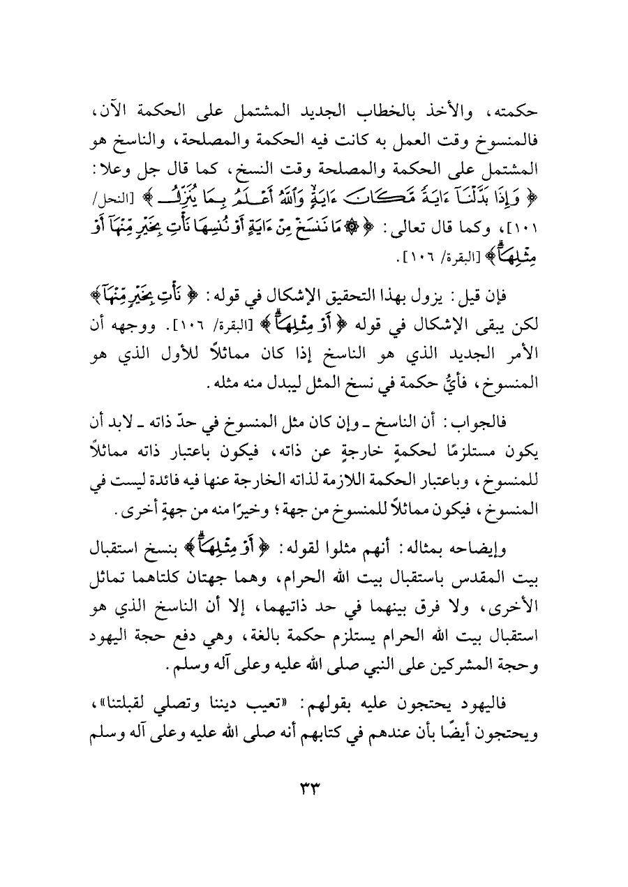 وإيضاحه بمثاله: أنهم مثلوا لقوله: {أَوْ مِثْلِهَا} بنسخ استقبال بيت المقدس باستقبال بيت اللَّه الحرام، وهما جهتان كلتاهما تماثل الأخرى، ولا فرق بينهما في حد ذاتيهما، إلا أن الناسخ الذي هو استقبال بيت اللَّه الحرام يستلزم حكمة بالغة، وهي دفع حجة اليهود وحجة المشركين على النبي صلى اللَّه عليه وعلى آله وسلم.