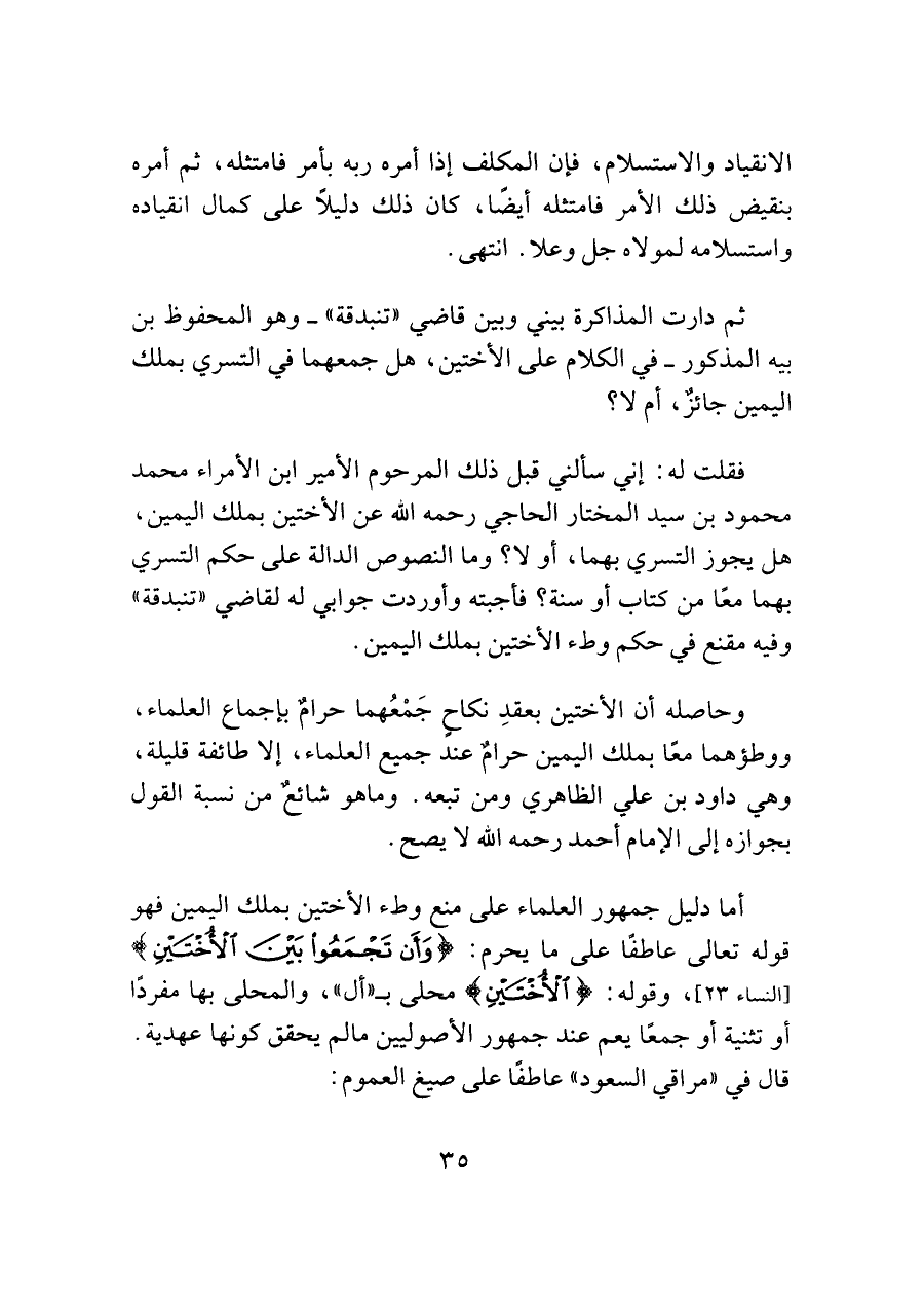 فقلت له: إني سألني قبل ذلك المرحوم الأمير ابن الأمراء محمد محمود بن سيد المختار الحاجي رحمه اللَّه عن الأختين بملك اليمين، هل يجوز التسري بهما، أو لا؟ وما النصوص الدالة على حكم التسري بهما معًا من كتاب أو سنة؟ فأجبته وأوردت جوابي له لقاضي "تنبدقة" وفيه مقنع في حكم وطء الأختين بملك اليمين.