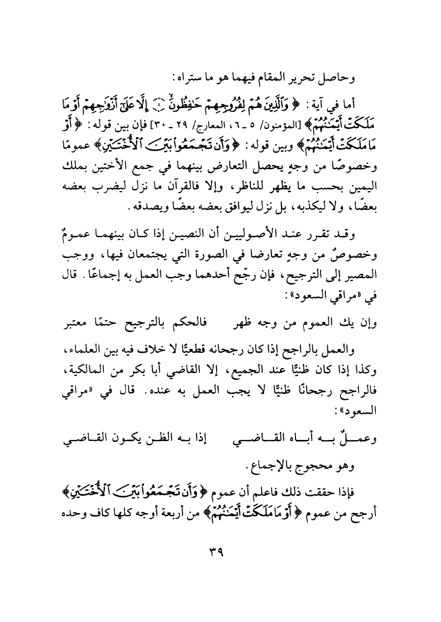 أما في آية: {وَالَّذِينَ هُمْ لِفُرُوجِهِمْ حَافِظُونَ (٥) إِلَّا عَلَى أَزْوَاجِهِمْ أَوْ مَا مَلَكَتْ أَيْمَانُهُمْ} [المؤمنون/ ٥ - ٦، المعارج/ ٢٩ - ٣٠] فإن بين قوله: {أَوْ مَا مَلَكَتْ أَيْمَانُهُمْ} وبين قوله: {وَأَنْ تَجْمَعُوا بَيْنَ الْأُخْتَيْنِ} عمومًا وخصوصًا من وجهٍ يحصل التعارض بينهما في جمع الأختين بملك اليمين بحسب ما يظهر للناظر، وإلا فالقرآن ما نزل ليضرب بعضه بعضًا، ولا ليكذبه، بل نزل ليوافق بعضه بعضًا ويصدقه.