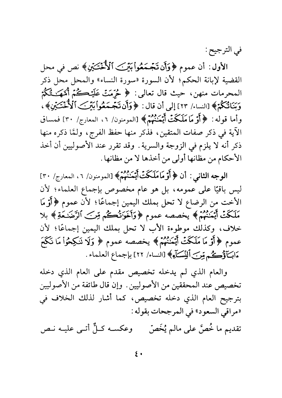 الأول: أن عموم {وَأَنْ تَجْمَعُوا بَيْنَ الْأُخْتَيْنِ} نص في محل القضية لإبانة الحكم؛ لأن السورة "سورة النساء" والمحل محل ذكر