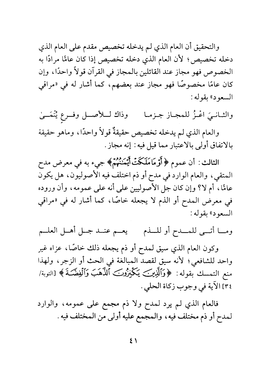 وكون العام الذي سيق لمدح أو ذم يجعله ذلك خاصًا، عزاه غير واحد للشافعي؛ لأنه سيق لقصد المبالغة في الحث أو الزجر، ولهذا منع التمسك بقوله: {وَالَّذِينَ يَكْنِزُونَ الذَّهَبَ وَالْفِضَّةَ} [التوبة/ ٣٤] الآية في وجوب زكاة الحلي.