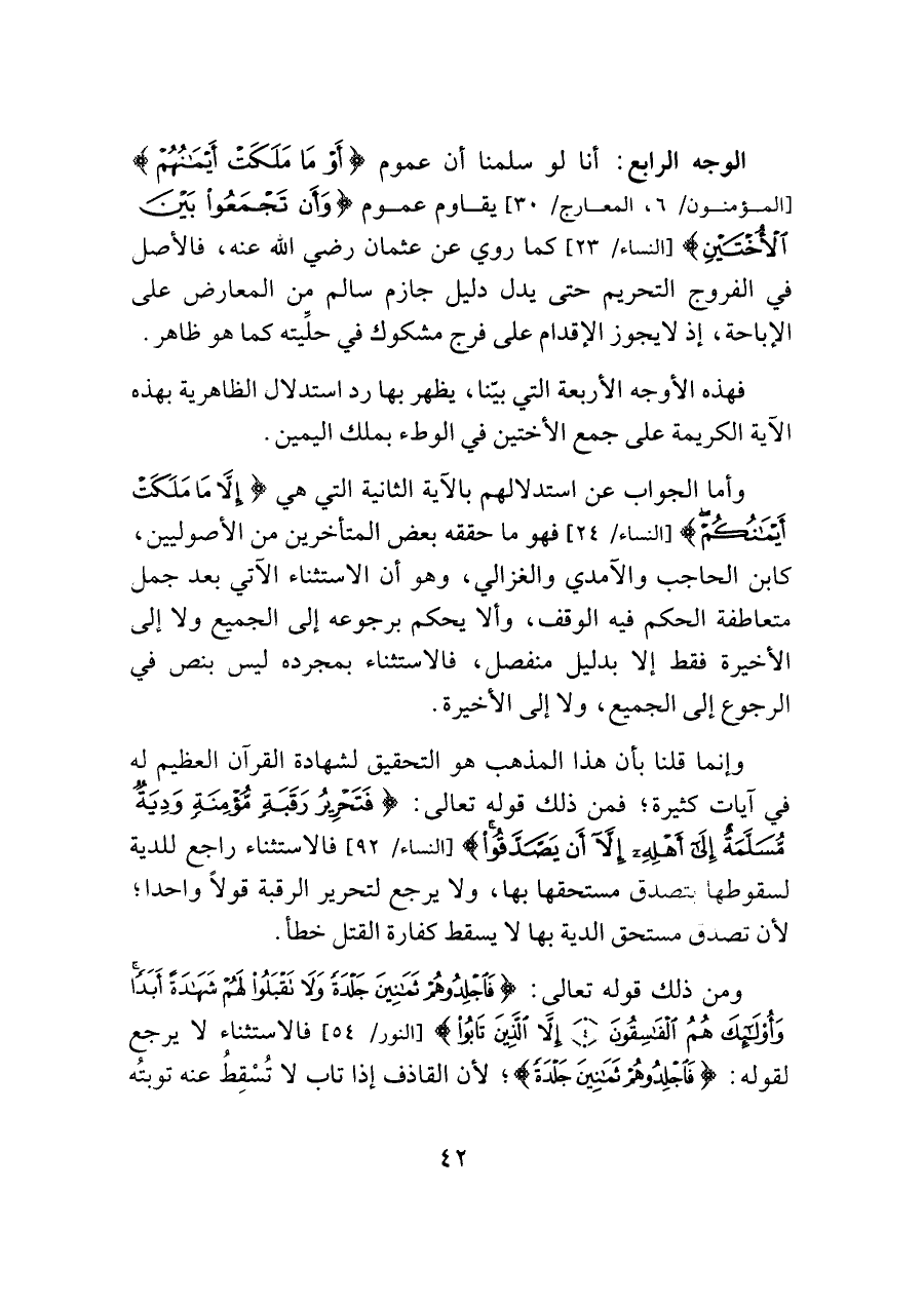 وأما الجواب عن استدلالهم بالآية الثانية التي هي {إِلَّا مَا مَلَكَتْ أَيْمَانُكُمْ} [النساء/ ٢٤] فهو ما حققه بعض المتأخرين من الأصوليين، كابن الحاجب والآمدي والغزالي، وهو أن الاستثناء الآتي بعد جمل متعاطفة الحكم فيه الوقف، وألا يحكم برجوعه إلى الجميع ولا إلى الأخيرة فقط إلا بدليل منفصل، فالاستثناء بمجرده ليس بنص في الرجوع إلى الجميع، ولا إلى الأخيرة.