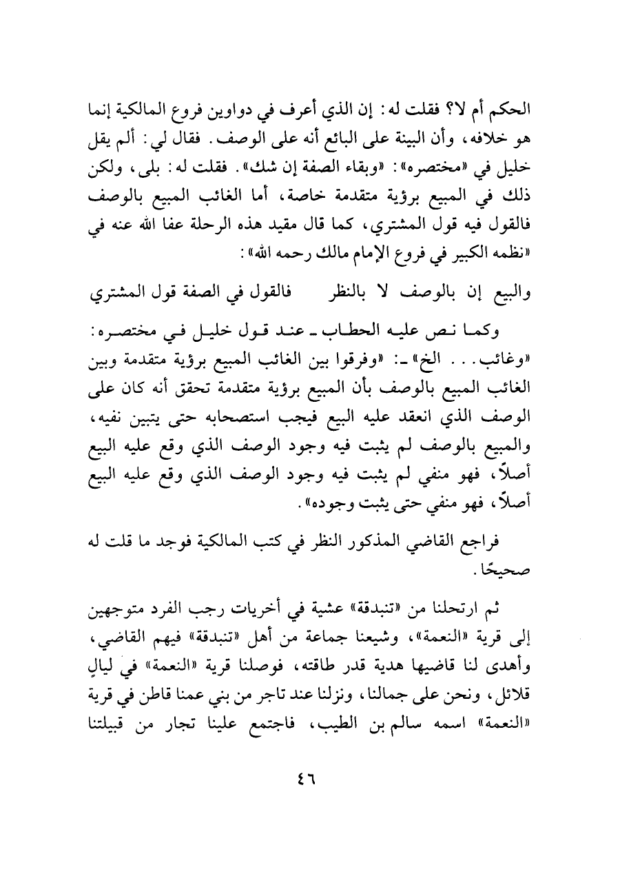 الحكم أم لا؟ فقلت له: إن الذيمما أعرف في دواوين فروع المالكية إنما هو خلافه، وأن البينة على البائع أنه على الوصف. فقال لي: ألم يقل خليل في "مختصره": "وبقاء الصفة إن شك". فقلت له: بلى، ولكن ذلك في المبيع برؤية متقدمة خاصة، أما الغائب المبيع بالوصف فالقول فيه قول المشتري، كما قال مقيد هذه الرحلة عفا اللَّه عنه في "نظمه الكبير في فروع الإمام مالك رحمه اللَّه":