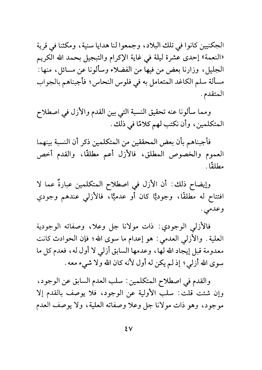 ومما سألونا عنه تحقيق النسبة التي بين القدم والأزل في اصطلاح المتكلمين، وأن نكتب لهم كلامًا في ذلك.