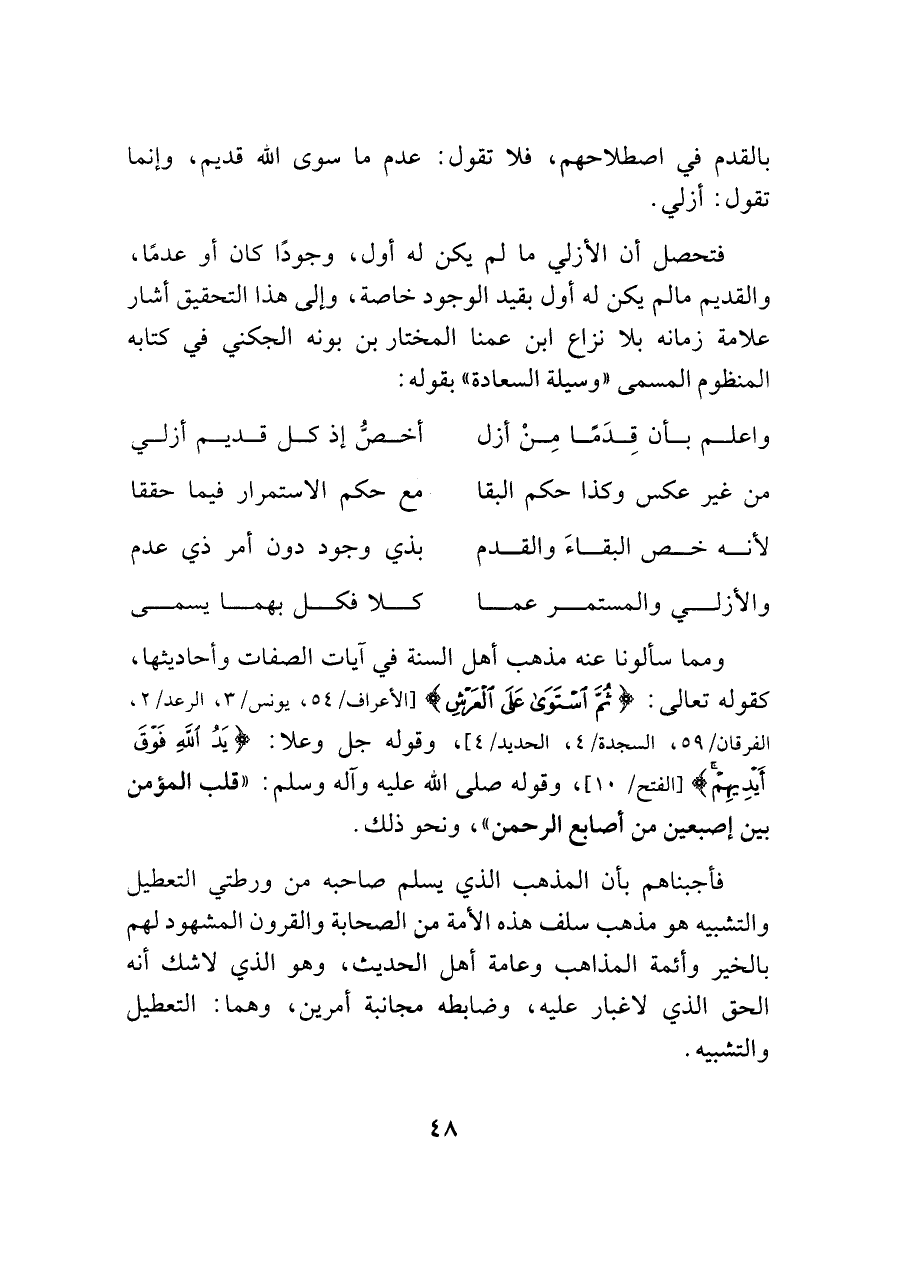 ومما سألونا عنه مذهب أهل السنة في آيات الصفات وأحاديثها، كقوله تعالى: {ثُمَّ اسْتَوَى عَلَى الْعَرْشِ} [الأعراف/ ٥٤، يونس/ ٣، الرعد/ ٢، الفرقان/ ٥٩، السجدة/ ٤، الحديد/ ٤]، وقوله جل وعلا: {يَدُ اللَّهِ فَوْقَ أَيْدِيهِمْ} [الفتح/ ١٠]، وقوله صلى اللَّه عليه وآله وسلم: "قلب المؤمن بين إصبعين من أصابع الرحمن"، ونحو ذلك.