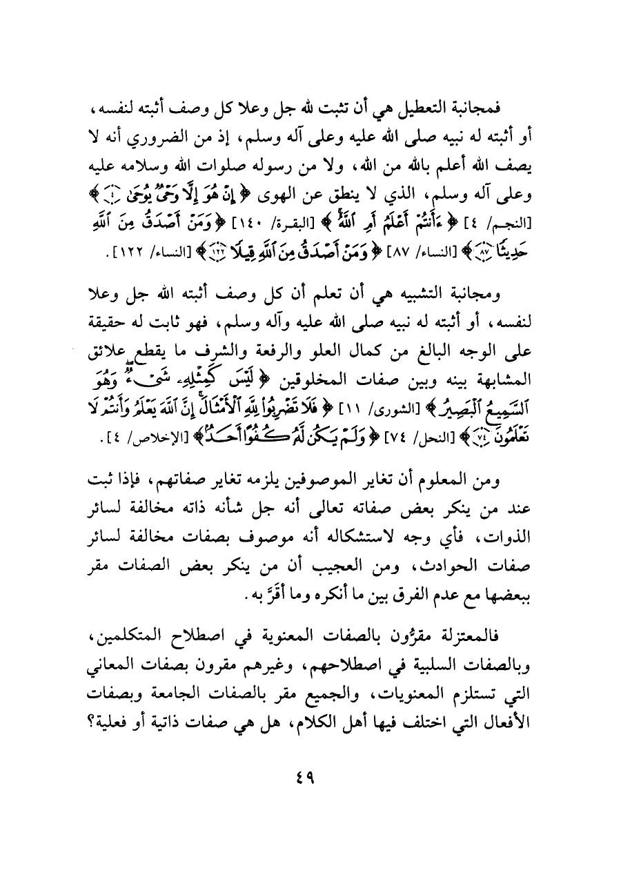 فالمعتزلة مقرُّون بالصفات المعنوية في اصطلاح المتكلمين، وبالصفات السلبية في اصطلاحهم، وغيرهم مقرُّون بصفات المعاني التي تستلزم المعنويات، والجميع مقر بالصفات الجامعة وبصفات الأفعال التي اختلف فيها أهل الكلام، هل هي صفات ذاتية أو فعلية؟