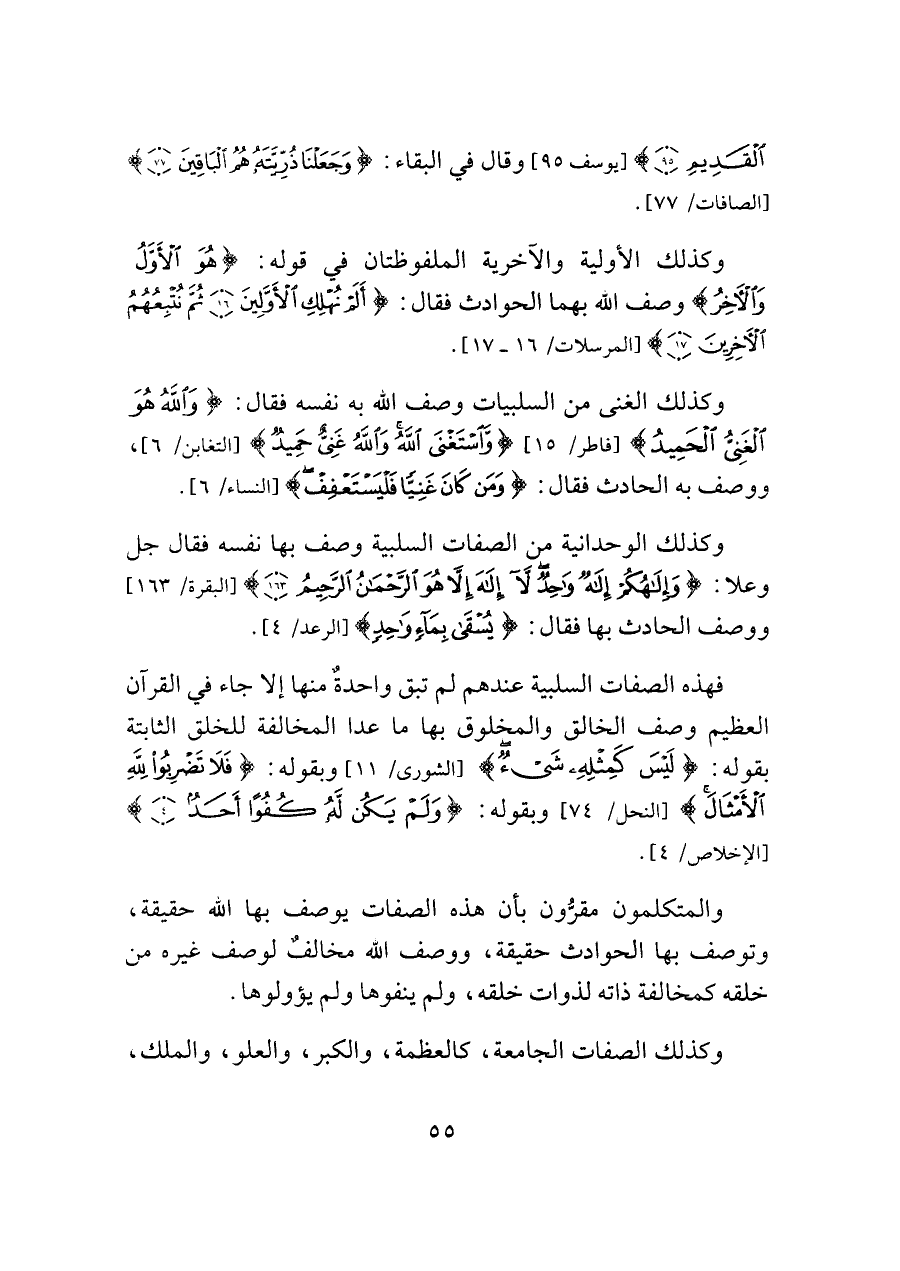 فهذه الصفات السلبية عندهم لم تبق واحدةٌ منها إلا جاء في القرآن العظيم وصف الخالق والمحلوق بها ما عدا المخالفة للخلق الثابتة بقوله: {لَيْسَ كَمِثْلِهِ شَيْءٌ} [الشورى/ ١١] وبقوله: {فَلَا تَضْرِبُوا لِلَّهِ الْأَمْثَالَ} [النحل/ ٧٤] وبقوله: {وَلَمْ يَكُنْ لَهُ كُفُوًا أَحَدٌ (٤)} [الإخلاص/ ٤].