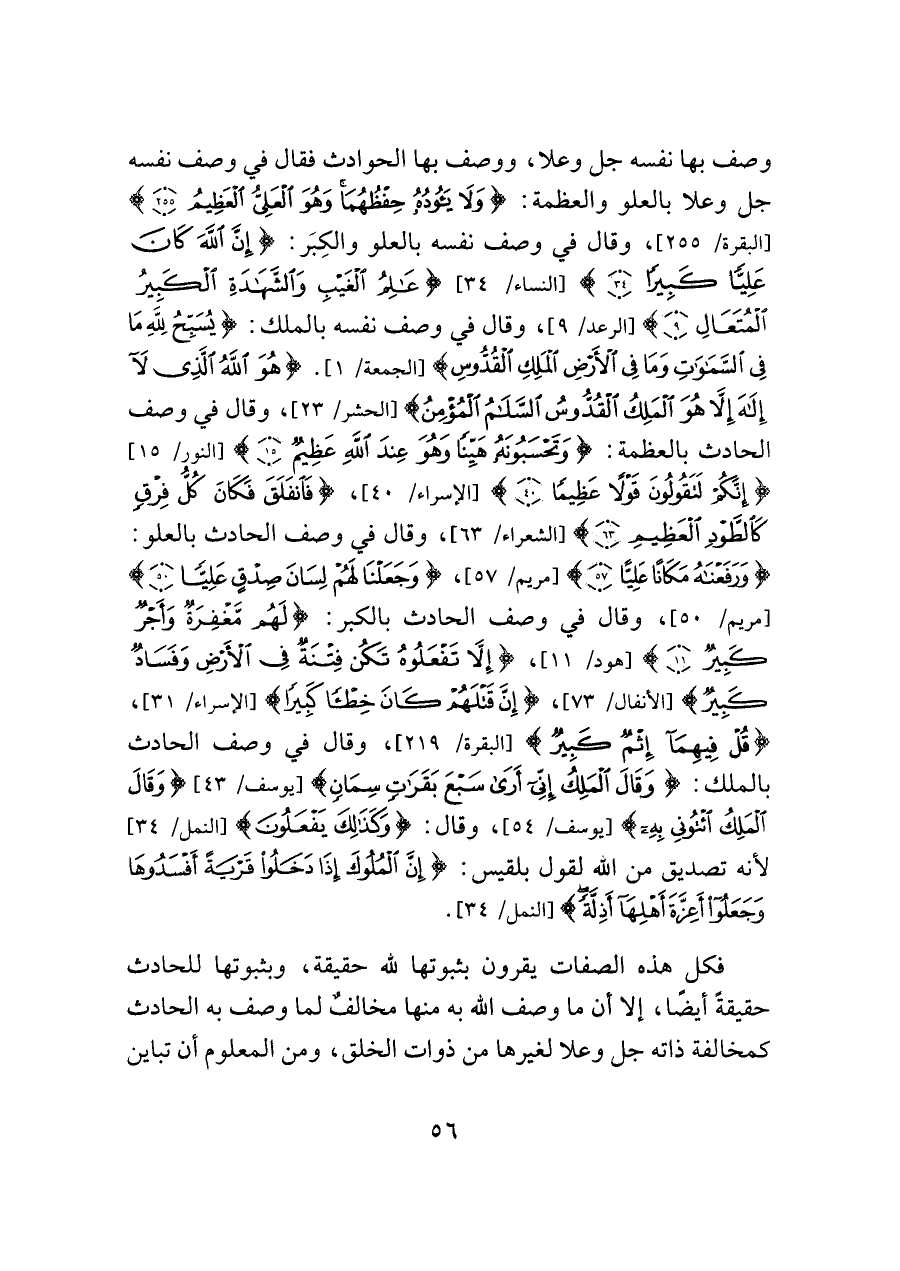وصف بها نفسه جل وعلا، ووصف بها الحوادث فقال في وصف نفسه جل وعلا بالعلو والعظمة: {وَلَا يَئُودُهُ حِفْظُهُمَا وَهُوَ الْعَلِيُّ الْعَظِيمُ (٢٥٥)} [البقرة/ ٢٥٥]، وقال في وصف نفسه بالعلو والكِبَر: {إِنَّ اللَّهَ كَانَ عَلِيًّا كَبِيرًا} [النساء/ ١٣٤] {عَالِمُ الْغَيْبِ وَالشَّهَادَةِ الْكَبِيرُ الْمُتَعَالِ (٩)} [الرعد: ٩]، وقال في وصف نفسه بالملك: {يُسَبِّحُ لِلَّهِ مَا فِي السَّمَاوَاتِ وَمَا فِي الْأَرْضِ الْمَلِكِ الْقُدُّوسِ} [الجمعة/ ١]. {هُوَ اللَّهُ الَّذِي لَا إِلَهَ إِلَّا هُوَ الْمَلِكُ الْقُدُّوسُ السَّلَامُ الْمُؤْمِنُ} [الحشر/ ٢٣]، وقال في وصف الحادث بالعظمة: {وَتَحْسَبُونَهُ هَيِّنًا وَهُوَ عِنْدَ اللَّهِ عَظِيمٌ (١٥)} [النور/ ١٥] {إِنَّكُمْ لَتَقُولُونَ قَوْلًا عَظِيمًا (٤٠)} [الإسراء/ ٤٠]، {فَانْفَلَقَ فَكَانَ كُلُّ فِرْقٍ كَالطَّوْدِ الْعَظِيمِ (٦٣)} [الشعراء/ ٦٣]، وقال في وصف الحادث بالعلو: {وَرَفَعْنَاهُ مَكَانًا عَلِيًّا (٥٧)} [مريم: ٥٧]، {وَجَعَلْنَا لَهُمْ لِسَانَ صِدْقٍ عَلِيًّا (٥٠)} [مريم/ ٥٠] وقال في وصف الحادث بالكبر: {لَهُمْ مَغْفِرَةٌ وَأَجْرٌ كَبِيرٌ (١١)} [هود/ ١١]، {إِلَّا تَفْعَلُوهُ تَكُنْ فِتْنَةٌ فِي الْأَرْضِ وَفَسَادٌ كَبِيرٌ} [الأنفال/ ٧٣]، {إِنَّ قَتْلَهُمْ كَانَ خِطْئًا كَبِيرًا} [الإسراء/ ٣١]، {قُلْ فِيهِمَا إِثْمٌ كَبِيرٌ} [البقرة/ ٢١٩]، وقال في وصف الحادث بالملك: {وَقَالَ الْمَلِكُ إِنِّي أَرَى سَبْعَ بَقَرَاتٍ سِمَانٍ} [يوسف/ ٤٣] {وَقَالَ الْمَلِكُ ائْتُونِي بِهِ} [يوسف/ ٥٤]، وقال: {وَكَذَلِكَ يَفْعَلُونَ} [النمل/ ٣٤] لأنه تصديقِ من اللَّه لقول بلقيس: {إِنَّ الْمُلُوكَ إِذَا دَخَلُوا قَرْيَةً أَفْسَدُوهَا وَجَعَلُوا أَعِزَّةَ أَهْلِهَا أَذِلَّةً} [النمل/ ٣٤].