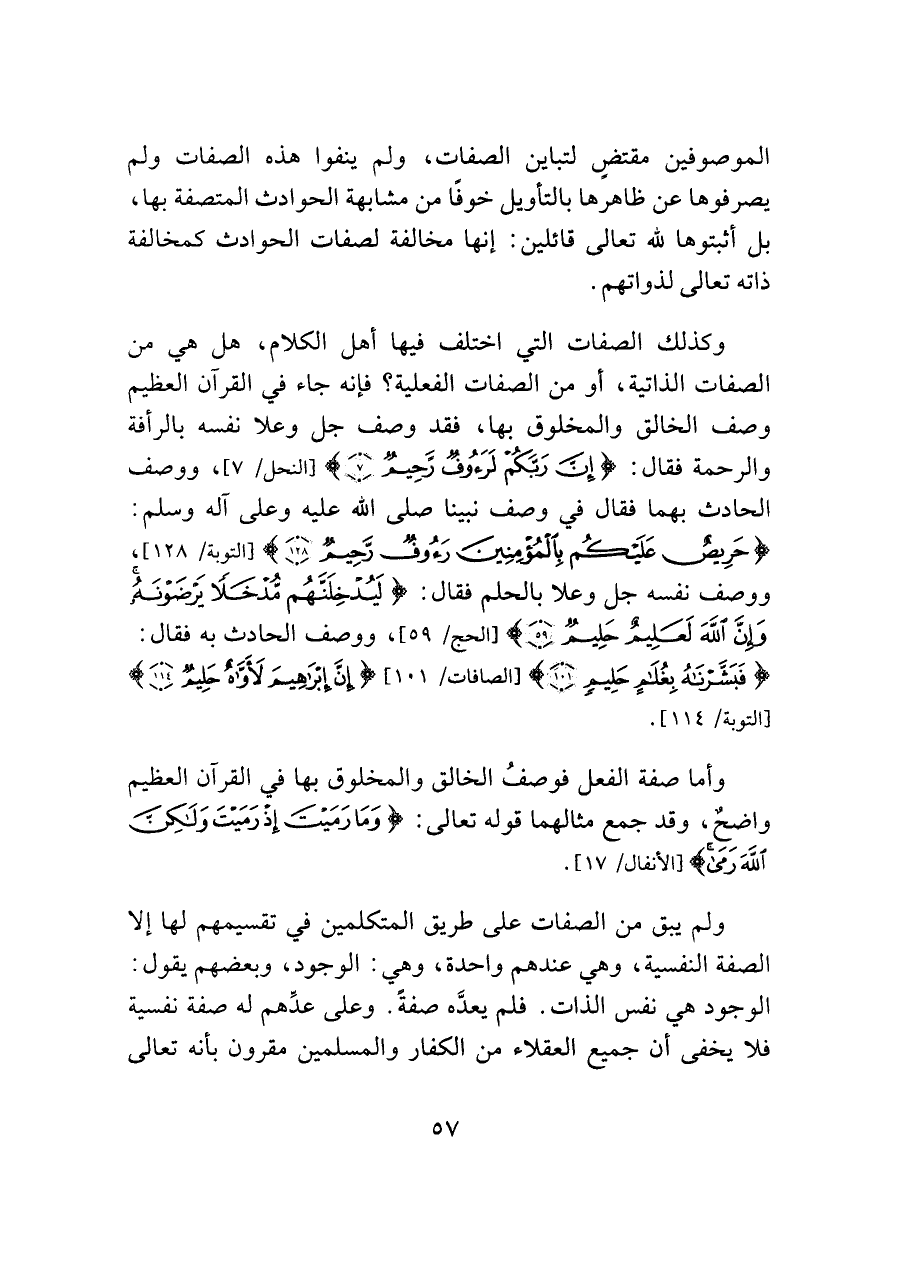 وكذلك الصفات التي اختلف فيها أهل الكلام، هل هي من الصفات الذاتية، أو من الصفات الفعلية؟ فإنه جاء في القرآن العظيم وصف الخالق والمخلوق بها، فقد وصف جل وعلا نفسه بالرأفة والرحمة فقال: {إِنَّ رَبَّكُمْ لَرَءُوفٌ رَحِيمٌ (٧)} [النحل/ ٧]، ووصف الحادث بهما فقال في وصف نبينا صلى اللَّه عليه وعلى آله وسلم: {حَرِيصٌ عَلَيْكُمْ بِالْمُؤْمِنِينَ رَءُوفٌ رَحِيمٌ (١٢٨)} [التوبة/ ١٢٨]، ووصف نفسه جل وعلا بالحلم فقال: {لَيُدْخِلَنَّهُمْ مُدْخَلًا يَرْضَوْنَهُ وَإِنَّ اللَّهَ لَعَلِيمٌ حَلِيمٌ (٥٩)} [الحج: ٥٩]، ووصف الحادث به فقال: {فَبَشَّرْنَاهُ بِغُلَامٍ حَلِيمٍ (١٠١)} [الصافات/ ١٠١] {إِنَّ إِبْرَاهِيمَ لَأَوَّاهٌ حَلِيمٌ (١١٤)} [التوبة/ ١١٤].