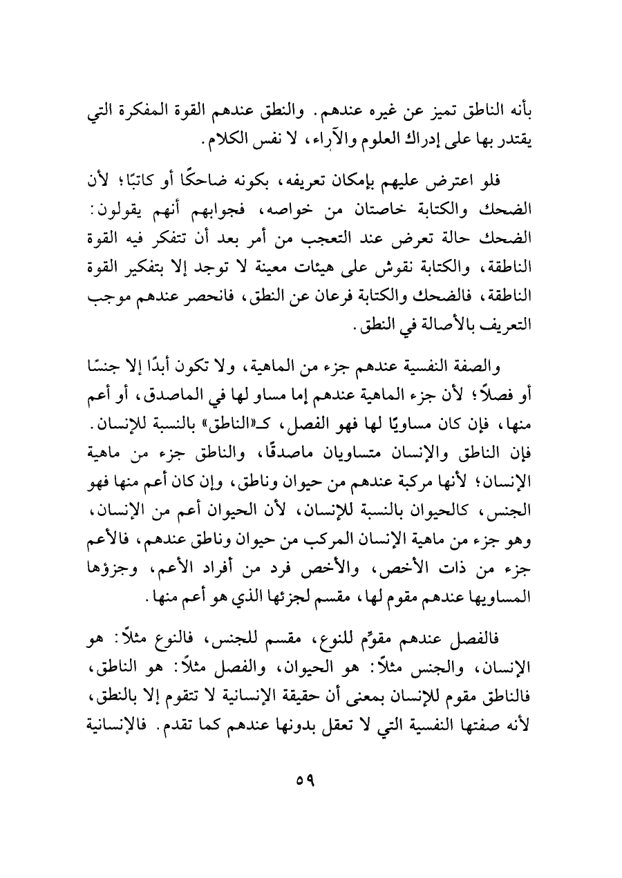 فلو اعترض عليهم بإمكان تعريفه، بكونه ضاحكًا أو كاتبًا؛ لأن الضحك والكتابة خاصتان من خواصه، فجوابهم أنهم يقولون: الضحك حالة تعرض عند التعجب من أمر بعد أن تتفكر فيه القوة الناطقة، والكتابة نقوش على هيئات معينة لا توجد إلا بتفكير القوة الناطقة، فالضحك والكتابة فرعان عن النطق، فانحصر عندهم موجب التعريف بالأصالة في النطق.