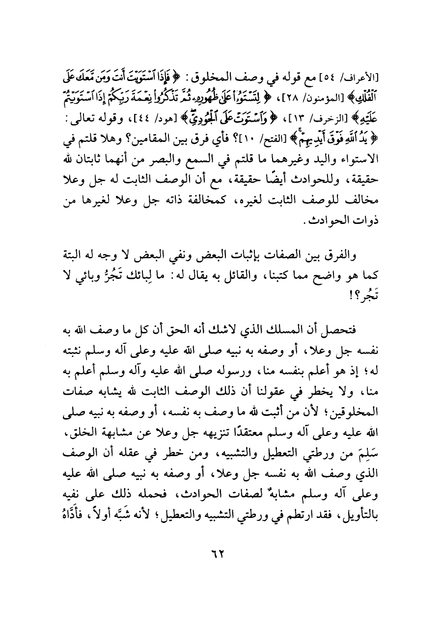 [الأعراف/ ٥٤] مع قوله في وصف المخلوق: {فَإِذَا اسْتَوَيْتَ أَنْتَ وَمَنْ مَعَكَ عَلَى الْفُلْكِ} [المؤمنون/ ١٢٨]، {لِتَسْتَوُوا عَلَى ظُهُورِهِ ثُمَّ تَذْكُرُوا نِعْمَةَ رَبِّكُمْ إِذَا اسْتَوَيْتُمْ عَلَيْهِ} [الزخرف/ ١٣]، {وَاسْتَوَتْ عَلَى الْجُودِيِّ} [هود/ ٤٤]، وقوله تعالى: {يَدُ اللَّهِ فَوْقَ أَيْدِيهِمْ} [الفتح/ ١٠]؟ فأي فرق بين المقامين؟ وهلا قلتم في الاستواء واليد وغيرهما ما قلتم في السمع والبصر من أنهما ثابتان للَّه حقيقة، وللحوادث أيضًا حقيقة، مع أن الوصف الثابت له جل وعلا مخالف للوصف الثابت لغيره، كمخالفة ذاته جل وعلا لغيرها من ذوات الحوادث.