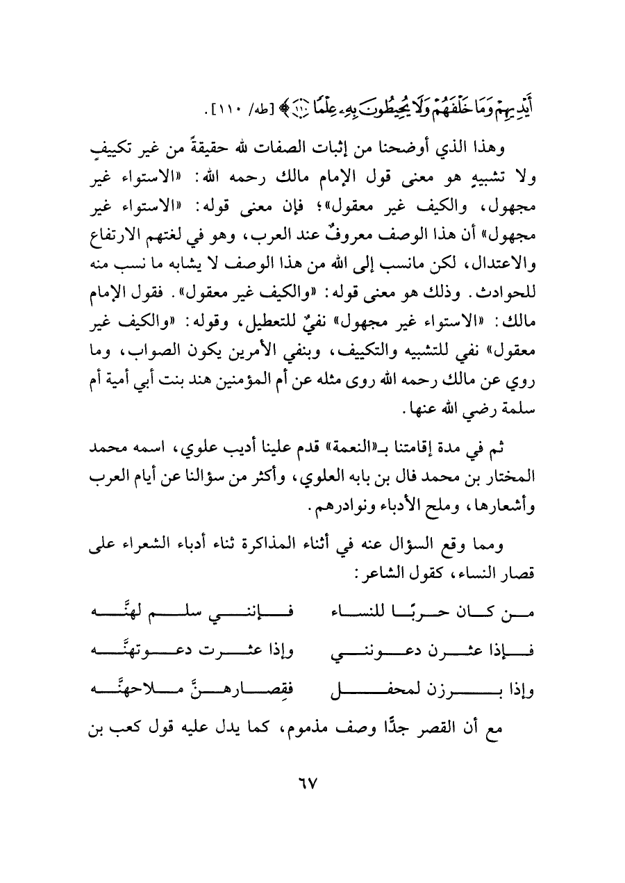 ثم في مدة إقامتنا بـ "النعمة" قدم علينا أديب علوي، اسمه محمد المختار بن محمد فال بن بابه العلوي، وأكثر من سؤالنا عن أيام العرب وأشعارها، وملح الأدباء ونوادرهم.