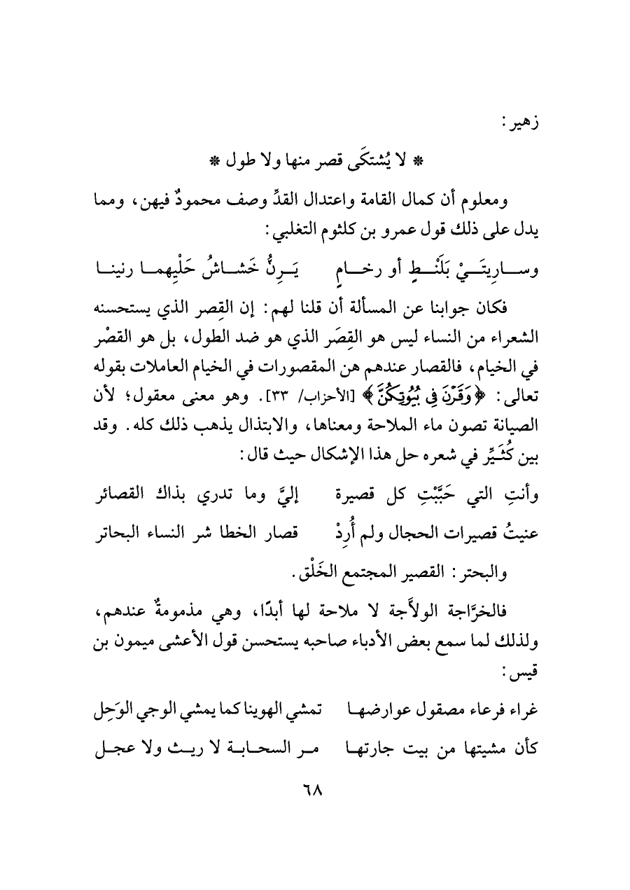 فكان جوابنا عن المسألة أن قلنا لهم: إن القِصر الذي يستحسنه الشعراء من النساء ليس هو القِصَر الذي هو ضد الطول، بل هو القصْر في الخيام، فالقصار عندهم هن المقصورات في الخيام العاملات بقوله تعالى: {وَقَرْنَ فِي بُيُوتِكُنَّ} [الأحزاب/ ٣٣]. وهو معنى معقول؛ لأن الصيانة تصون ماء الملاحة ومعناها، والابتذال يذهب ذلك كله. وقد بين كُثَيِّر في شعره حل هذا الإشكال حيث قال: