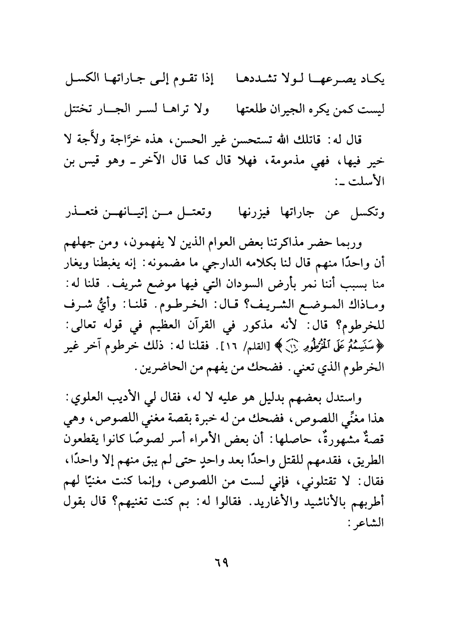واستدل بعضهم بدليل هو عليه لا له، فقال لي الأديب العلوي: هذا مغنِّي اللصوص، فضحك من له خبرة بقصة مغني اللصوص، وهي قصةٌ مشهورةٌ، حاصلها: أن بعض الأمراء أسر لصوصًا كانوا يقطعون الطريق، فقدمهم للقتل واحدًا بعد واحدٍ حتى لم يبق منهم إلا واحدًا، فقال: لا تقتلوني، فإني لست من اللصوص، وإنما كنت مغنيًا لهم أطربهم بالأناشيد والأغاريد. فقالوا له: بم كنت تغنيهم؟ قال بقول الشاعر:
