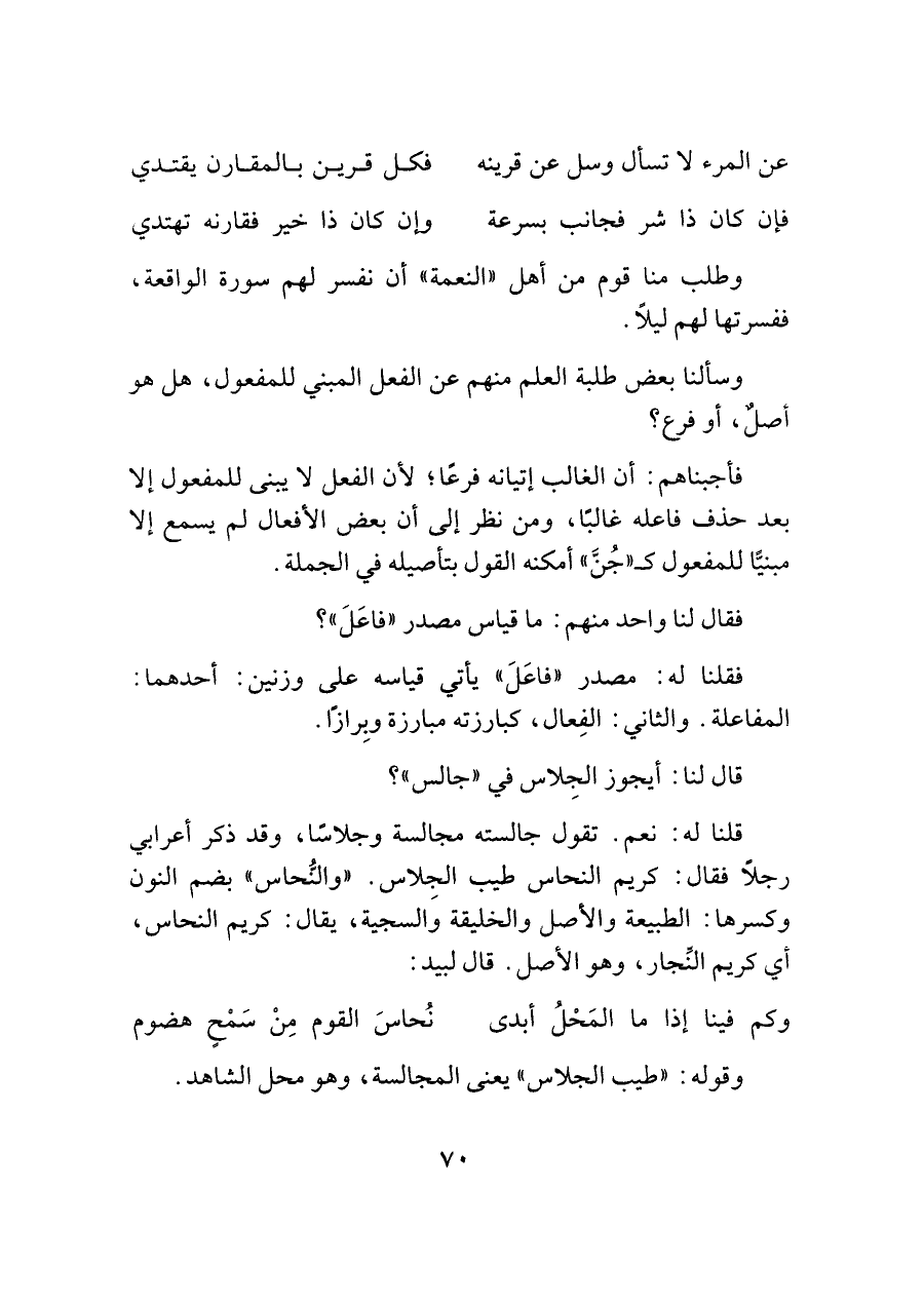 قلنا له: نعم. تقول جالسته مجالسة وجلاسًا، وقد ذكر أعرابي رجلًا فقال: كريم النحاس طيب الجِلاس. "والنُّحاس" بضم النون وكسرها: الطبيعة والأصل والخليقة والسجية، يقال: كريم النحاس، أي كريم النِّجار، وهو الأصل. قال لبيد: