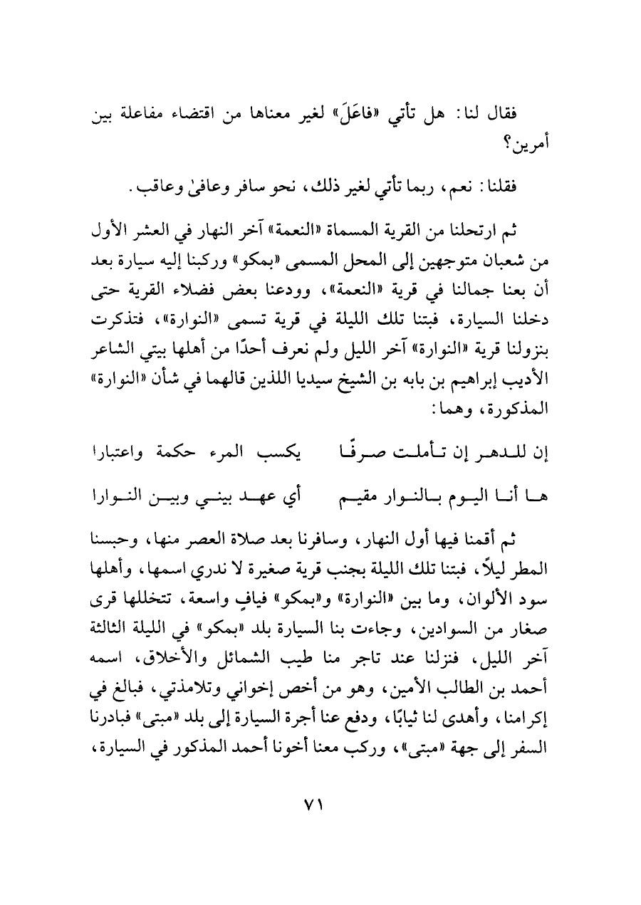 ثم ارتحلنا من القرية المسماة "النعمة" آخر النهار في العشر الأول من شعبان متوجهين إلى المحل المسمى "بمكو" وركبنا إليه سيارة بعد أن بعنا جمالنا في قرية "النعمة"، وودعنا بعض فضلاء القرية حتى دخلنا السيارة، فبتنا تلك الليلة في قرية تسمى "النوارة"، فتذكرت بنزولنا قرية "النوارة" آخر الليل ولم نعرف أحدًا من أهلها بيتي الشاعر الأديب إبراهيم بن بابه بن الشيخ سيديا اللذين قالهما في شأن "النوارة" المذكورة، وهما: