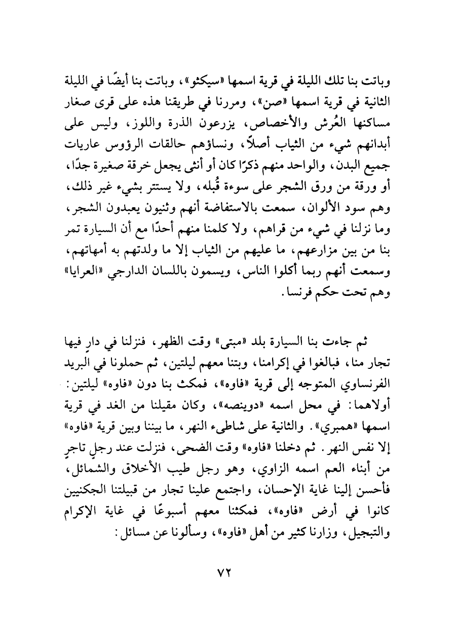 وباتت بنا تلك الليلة في قرية اسمها "سيكثو"، وباتت بنا أيضًا في الليلة الثانية في قرية اسمها "صن"، ومررنا في طريقنا هذه على قرى صغار مساكنها العُرش والأخصاص، يزرعون الذرة واللوز، وليس على أبدانهم شيء من الثياب أصلًا، ونساؤهم حالقات الرؤوس عاريات جميع البدن، والواحد منهم ذكرًا كان أو أنثى يجعل خرقة صغيرة جدًا، أو ورقة من ورق الشجر على سوءة قُبله، ولا يستتر بشيء غير ذلك، وهم سود الألوان، سمعت بالاستفاضة أنهم وثنيون يعبدون الشجر، وما نزلنا في شيء من قراهم، ولا كلمنا منهم أحدًا مع أن السيارة تمر بنا من بين مزارعهم، ما عليهم من الثياب إلا ما ولدتهم به أمهاتهم، وسمعت أنهم ربما أكلوا الناس، ويسمون باللسان الدارجي "العرايا" وهم تحت حكم فرنسا.