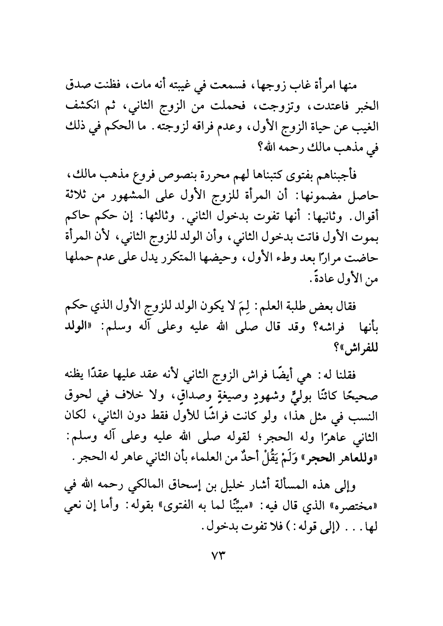 فأجبناهم بفتوى كتبناها لهم محررة بنصوص فروع مذهب مالك، حاصل مضمونها: أن المرأة للزوج الأول على المشهور من ثلاثة أقوال. وثانيها: أنها تفوت بدخول الثاني. وثالثها: إن حكم حاكم بموت الأول فاتت بدخول الثاني، وأن الولد للزوج الثاني، لأن المرأة حاضعت مرارًا بعد وطء الأول، وحيضها المتكرر يدل على عدم حملها من الأول عادةً.