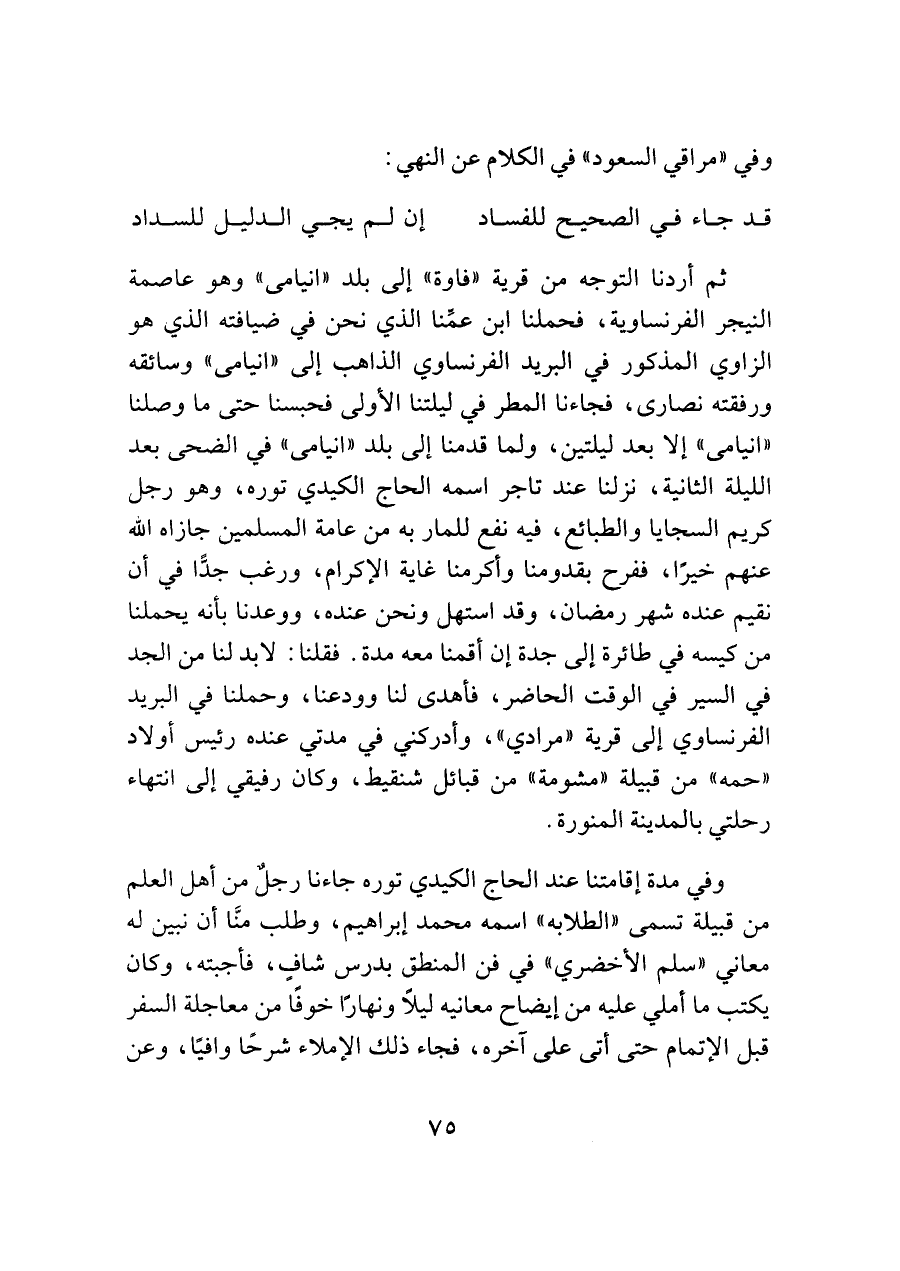 ثم أردنا التوجه من قرية "فاوة" إلى بلد "انيامى" وهو عاصمة النيجر الفرنساوية، فحملنا ابن عمِّنا الذي نحن في ضيافته الذي هو الزاوي المذكور في البريد الفرنساوي الذاهب إلى "انيامى" وسائقه ورفقته نصارى، فجاءنا المطر في ليلتنا الأولى فحبسنا حتى ما وصلنا "انيامى" إلا بعد ليلتين، ولما قدمنا إلى بلد "انيامى" في الضحى بعد الليلة الثانية، نزلنا عند تاجر اسمه الحاج الكيدي توره، وهو رجل كريم السجايا والطبائع، فيه نفع للمار به من عامة المسلمين جازاه اللَّه عنهم خيرًا، ففرح بقدومنا وأكرمنا غاية الإكرام، ورغب جدًّا في أن نقيم عنده شهر رمضان، وقد استهل ونحن عنده، ووعدنا بأنه يحملنا من كيسه في طائرة إلى جدة إن أقمنا معه مدة. فقلنا: لابد لنا من الجد في السير في الوقت الحاضر، فأهدى لنا وودعنا، وحملنا في البريد الفرنساوي إلى قرية "مرادي"، وأدركني في مدتي عنده رئيس أولاد "حمه" من قبيلة "مشومة" من قبائل شنقيط، وكان رفيقي إلى انتهاء رحلتي بالمدينة المنورة.