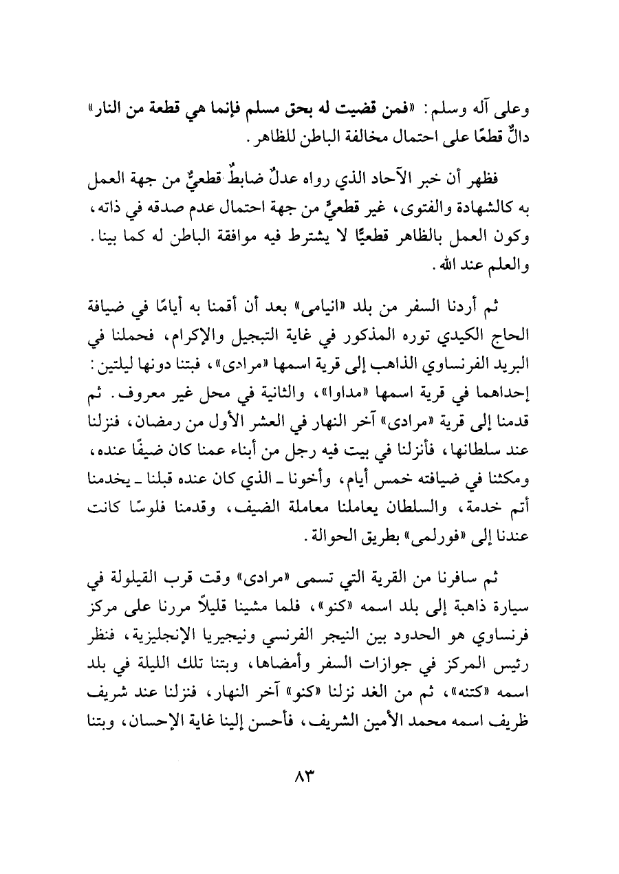 ثم سافرنا من القرية التي تسمى "مرادى" وقت قرب القيلولة في سيارة ذاهبة إلى بلد اسمه "كنو"، فلما مشينا قليلًا مررنا على مركز فرنساوي هو الحدود بين النيجر الفرنسي ونيجيريا الإنجليزية، فنظر رئيس المركز في جوازات السفر وأمضاها، وبتنا تلك الليلة في بلد اسمه "كتنه"، ثم من الغد نزلنا "كنو" آخر النهار، فنزلنا عند شريف ظريف اسمه محمد الأمين الشريف، فأحسن إلينا غاية الإحسان، وبتنا