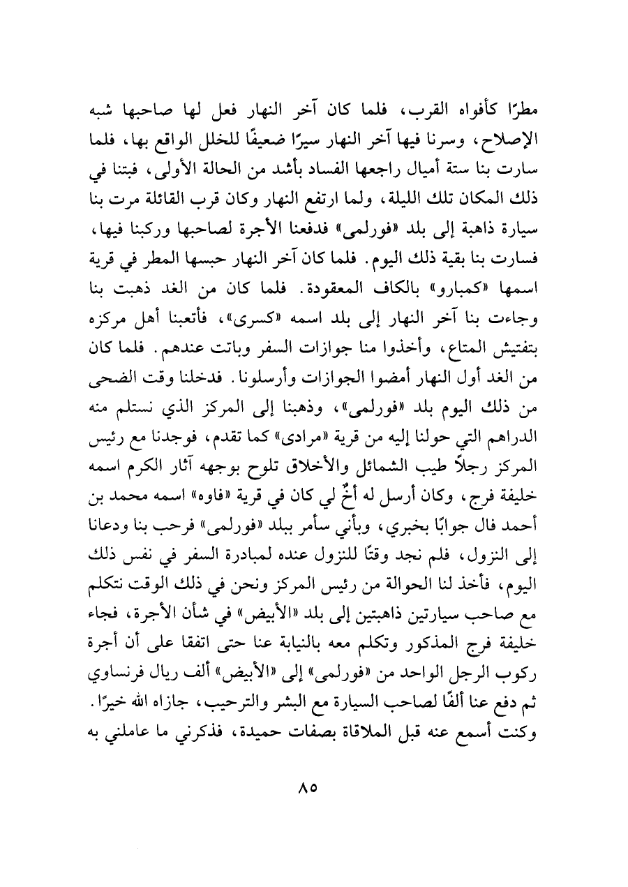 مطرًا كأفواه القرب، فلما كان آخر النهار فعل لها صاحبها شبه الإصلاح، وسرنا فيها آخر النهار سيرًا ضعيفًا للخلل الواقع بها، فلما سارت بنا ستة أميال راجعها الفساد بأشد من الحالة الأولى، فبتنا في ذلك المكان تلك الليلة، ولما ارتفع النهار وكان قرب القائلة مرت بنا سيارة ذاهبة إلى بلد "فورلمى" فدفعنا الأجرة لصاحبها وركبنا فيها، فسارت بنا بقية ذلك اليوم. فلما كان آخر النهار حبسها المطر في قرية اسمها "كمبارو" بالكاف المعقودة. فلما كان من الغد ذهبت بنا وجاءت بنا آخر النهار إلى بلد اسمه "كسرى"، فأتعبنا أهل مركزه بتفتيش المتاع، وأخذوا منا جوازات السفر وباتت عندهم. فلما كان من الغد أول النهار أمضوا الجوازات وأرسلونا. فدخلنا وقت الضحى من ذلك اليوم بلد "فورلمى"، وذهبنا إلى المركز الذي نستلم منه الدراهم التي حولنا إليه من قرية "مرادى" كما تقدم، فوجدنا مع رئيس المركز رجلًا طيب الشمائل والأخلاق تلوح بوجهه آثار الكرم اسمه خليفة فرج، وكان أرسل له أخٌ لي كان في قرية "فاوه" اسمه محمد بن أحمد فال جوابًا بخبري، وبأني سأمر ببلد "فورلمى" فرحب بنا ودعانا إلى النزول، فلم نجد وقتًا للنزول عنده لمبادرة السفر في نفس ذلك اليوم، فأخذ لنا الحوالة من رئيس المركز ونحن في ذلك الوقت نتكلم مع صاحب سيارتين ذاهبتين إلى بلد "الأبيض" في شأن الأجرة، فجاء خليفة فرج المذكور وتكلم معه بالنيابة عنا حتى اتفقا على أن أجرة ركوب الرجل الواحد من "فورلمى" إلى "الأبيض" ألف ريال فرنساوي ثم دفع عنا ألفًا لصاحب السيارة مع البشر والترحيب، جازاه اللَّه خيرًا. وكنت أسمع عنه قبل الملاقاة بصفات حميدة، فذكرني ما عاملني به