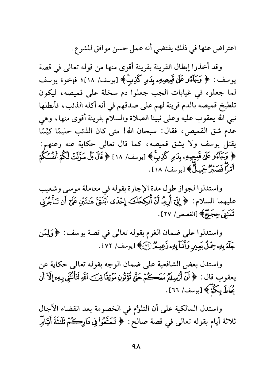 وقد أخذوا إبطال القرينة بقرينة أقوى منها من قوله تعالى في قصة يوسف: {وَجَاءُوا عَلَى قَمِيصِهِ بِدَمٍ كَذِبٍ} [يوسف/ ١٨]؛ فإخوة يوسف لما جعلوه في غيابات الجب جعلوا دم سخلة على قميصه، ليكون تلطيخ قميصه بالدم قرينة لهم على صدقهم في أنه أكله الذئب، فأبطلها نبي اللَّه يعقوب عليه وعلى نبينا الصلاة والسلام بقرينة أقوى منها، وهي عدم شق القميص، فقال: سبحان اللَّه! متى كان الذئب حليمًا كيِّسًا يقتل يوسف ولا يشق قميصه، كما قال تعالى حكاية عنه وعنهم: {وَجَاءُوا عَلَى قَمِيصِهِ بِدَمٍ كَذِبٍ} [يوسف/ ١٨] {بَلْ سَوَّلَتْ لَكُمْ أَنْفُسُكُمْ أَمْرًا فَصَبْرٌ جَمِيلٌ} [يوسف/ ١٨].