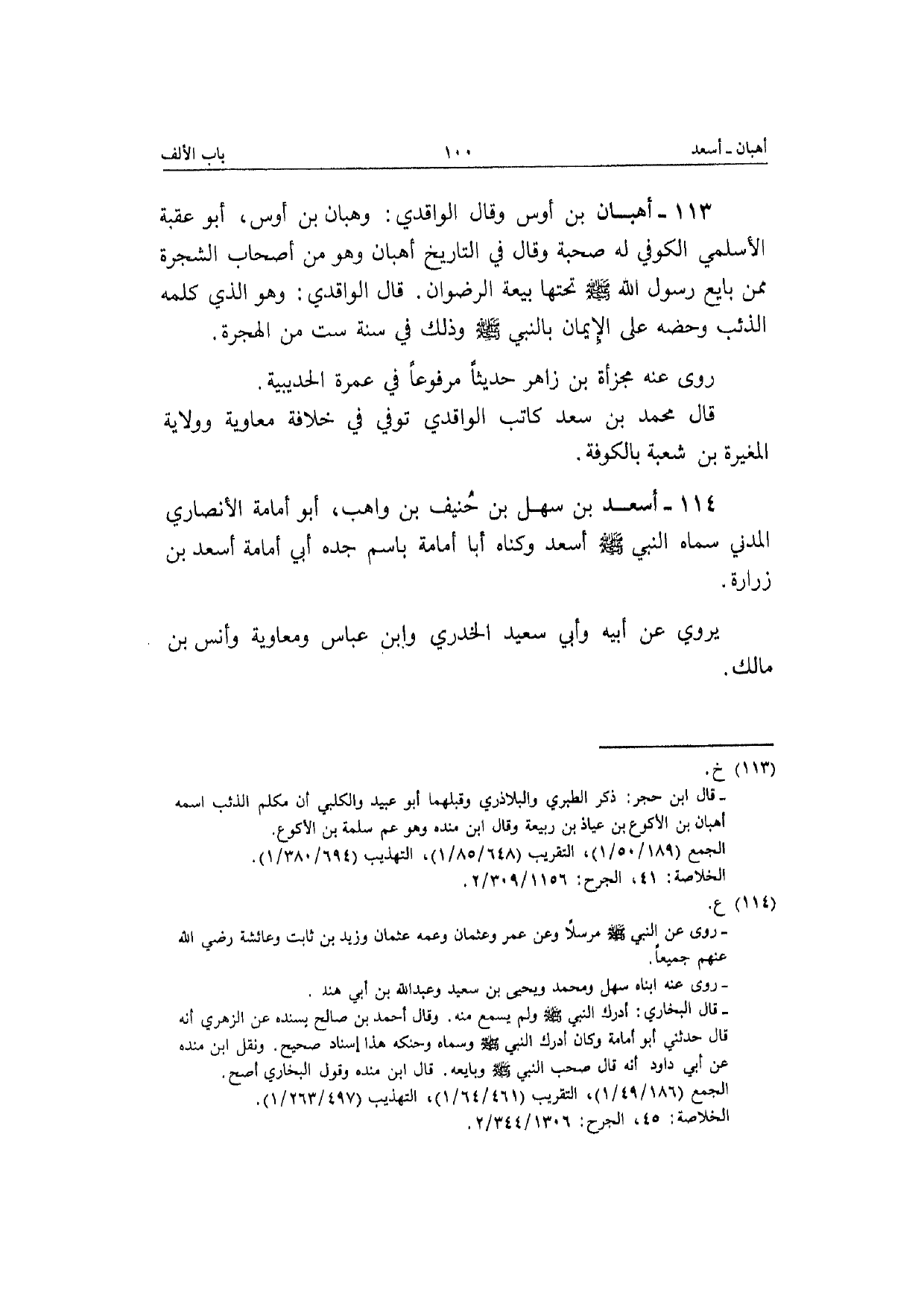 113 - أهبان بن أَوْس وَقَالَ الْوَاقِدِيّ وهبان بن أَوْس أَبُو عقبَة الْأَسْلَمِيّ الْكُوفِي لَهُ صُحْبَة وَقَالَ فِي التَّارِيخ أهبان وَهُوَ من أَصْحَاب الشَّجَرَة مِمَّن بَايع رَسُول الله صَلَّى الله عَلَيْهِ وَسلم تحتهَا بيعَة الرضْوَان قَالَ الْوَاقِدِيّ وَهُوَ الَّذِي كَلمه الذِّئْب وحضه عَلَى الْإِيمَان بِالنَّبِيِّ صَلَّى الله عَلَيْهِ وَسلم وَذَلِكَ فِي سنة سِتّ من الْهِجْرَة رَوَى عَنهُ عَنهُ مجزأَة بن زَاهِر حَدِيثا مَرْفُوعا فِي عمْرَة الْحُدَيْبِيَة قَالَ مُحَمَّد بن سعد كَاتب الْوَاقِدِيّ توفّي فِي خلَافَة مُعَاوِيَة وَولَايَة الْمُغيرَة بن شُعْبَة بِالْكُوفَةِ