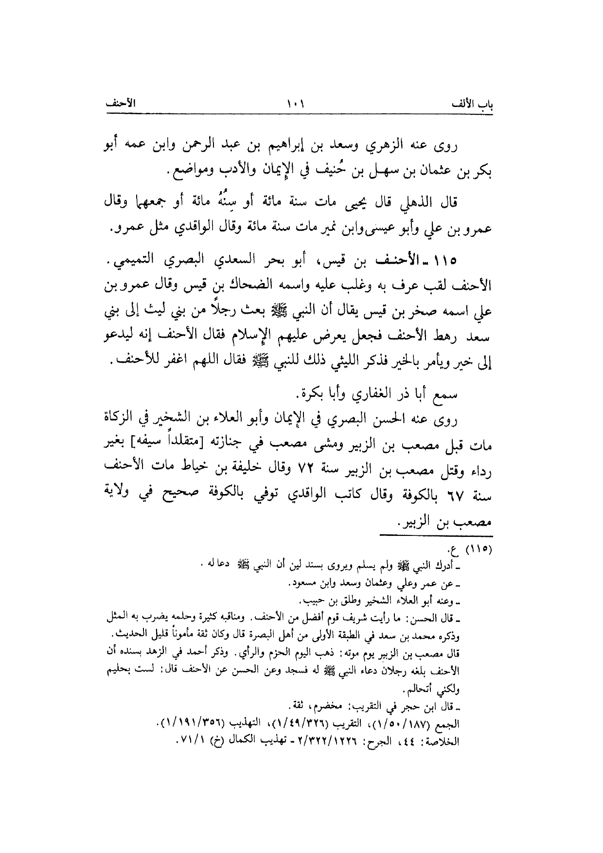 115 - الْأَحْنَف بن قيس أَبُو بَحر السَّعْدِيّ الْبَصْرِيّ التَّمِيمِي الْأَحْنَف لقب عرف بِهِ وَغلب عَلَيْهِ واسْمه الضَّحَّاك بن قيس وَقَالَ عَمْرو بن عَلّي اسْمه صَخْر بن قيس يُقَال إِن النَّبِي صَلَّى الله عَلَيْهِ وَسلم بعث رجلا من بني لَيْث إِلَى بني سعد رَهْط الْأَحْنَف فَجعل يعرض عَلَيْهِم الْإِسْلَام فَقَالَ الْأَحْنَف إِنَّه ليدعو إِلَى خير وَيَأْمُر بِالْخَيرِ فَذكر اللَّيْثِيّ ذَلِك للنَّبِي صَلَّى الله عَلَيْهِ وَسلم فَقَالَ اللَّهُمَّ اغْفِر للأحنف سمع أَبَا ذَر الْغِفَارِيّ وَأَبا بكرَة رَوَى عَنهُ الْحسن الْبَصْرِيّ فِي الْإِيمَان وَأَبُو الْعَلَاء بن الشخير فِي الزَّكَاة مَاتَ قبل مُصعب بن الزبير وَمَشى مُصعب فِي جنَازَته [مُتَقَلِّدًا سَيْفه] بِغَيْر رِدَاء وَقتل مُصعب بن الزبير سنة 72 وَقَالَ خَليفَة بن خياط مَاتَ الْأَحْنَف سنة 67 بِالْكُوفَةِ وَقَالَ كَاتب الْوَاقِدِيّ توفّي بِالْكُوفَةِ صَحِيح فِي ولَايَة مُصعب بن الزبير